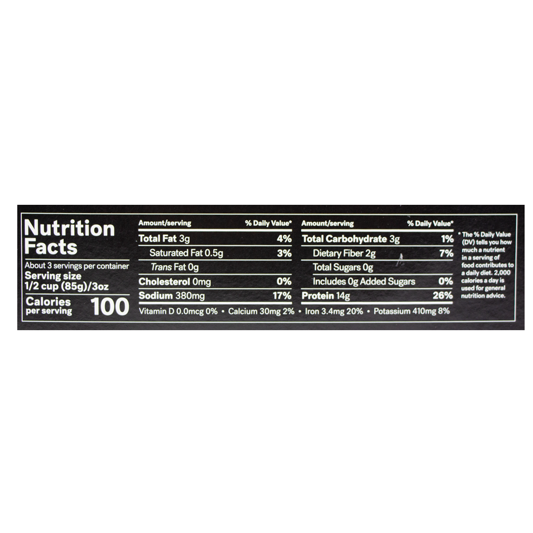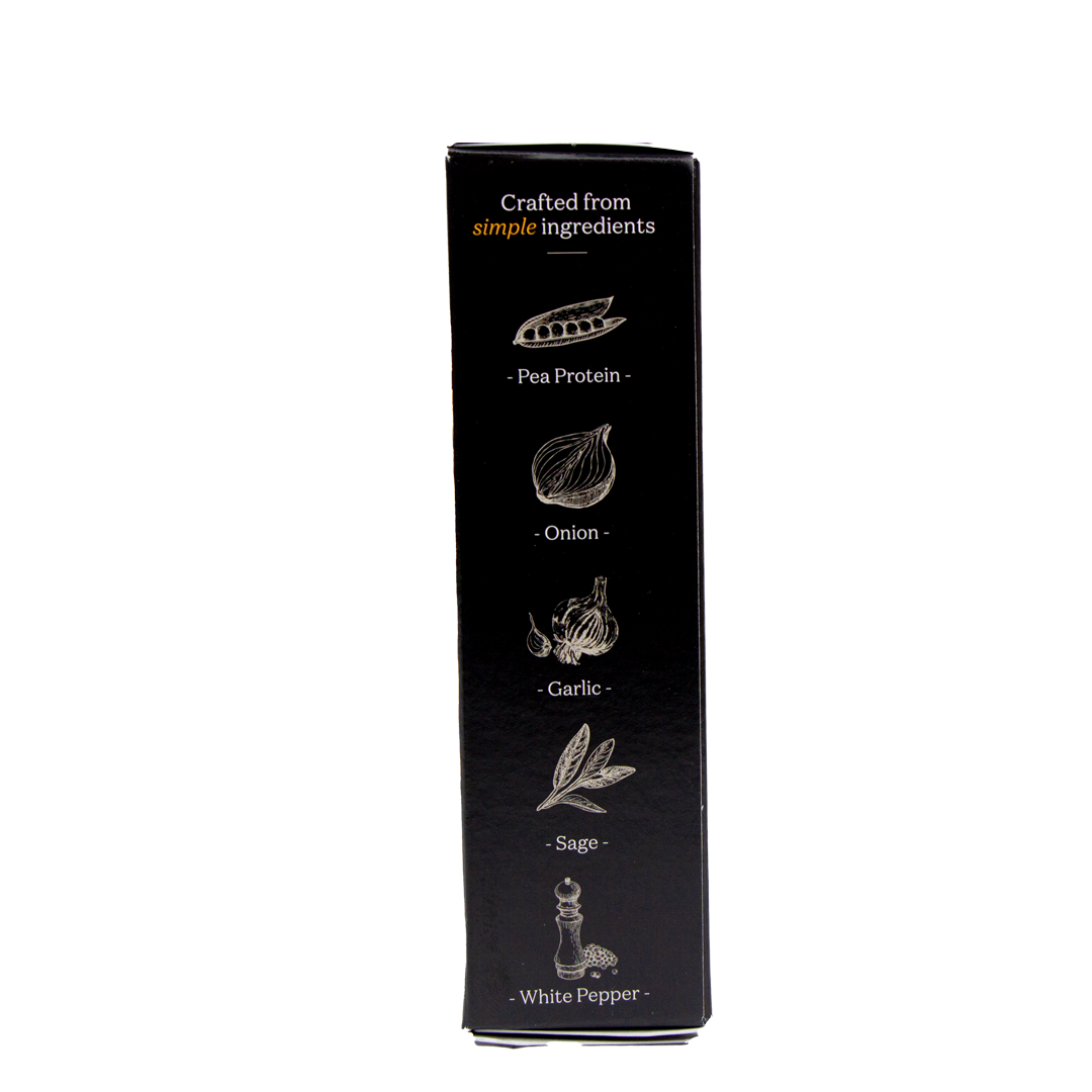 Agua filtrada, Proteína de guisante, Aceite de oliva virgen extra, Vinagre, Sal marina, Cebolla en polvo, Levadura nutricional, Ajo en polvo, Cúrcuma, Salvia, Semilla de apio, Tomillo, Mejorana, Macis, Pimienta blanca.