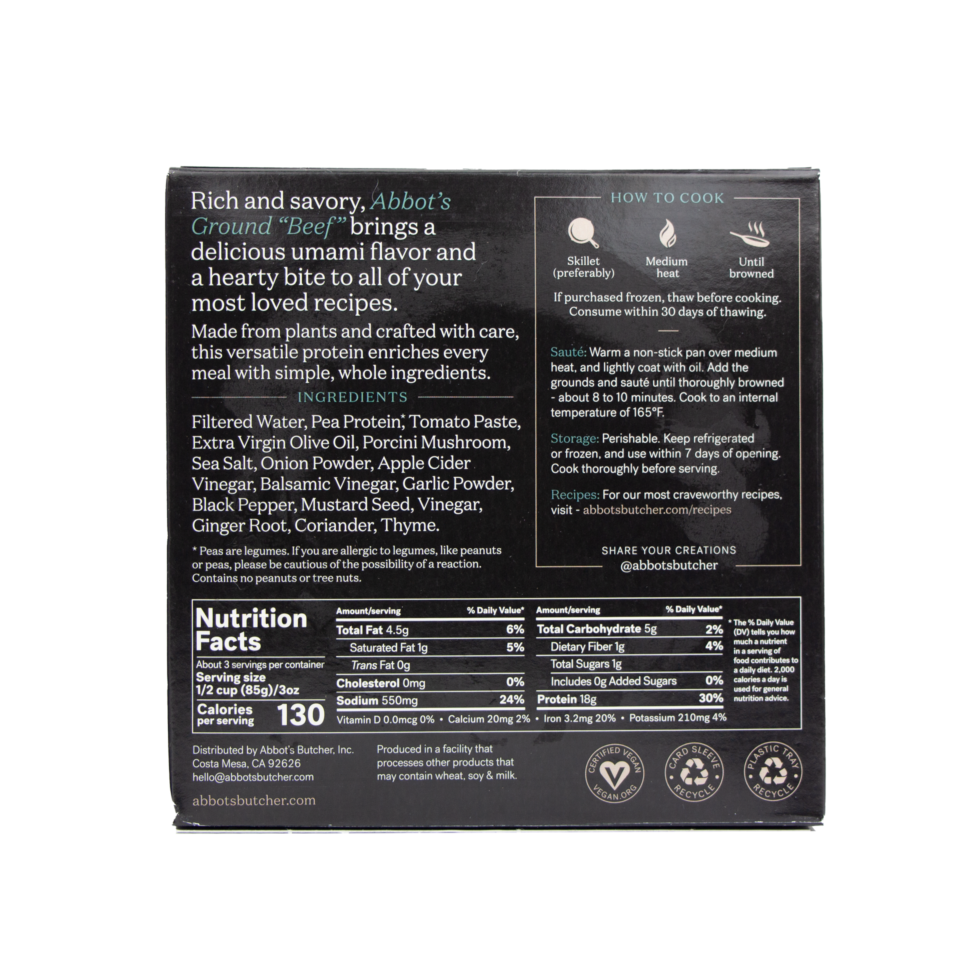 Agua filtrada, proteína de guisante, pasta de tomate, aceite de oliva virgen extra, champiñones porcini, sal marina, cebolla en polvo, vinagre de sidra de manzana, vinagre balsámico, ajo en polvo, pimienta negra, semillas de mostaza, vinagre, raíz de jengibre, cilantro, tomillo.