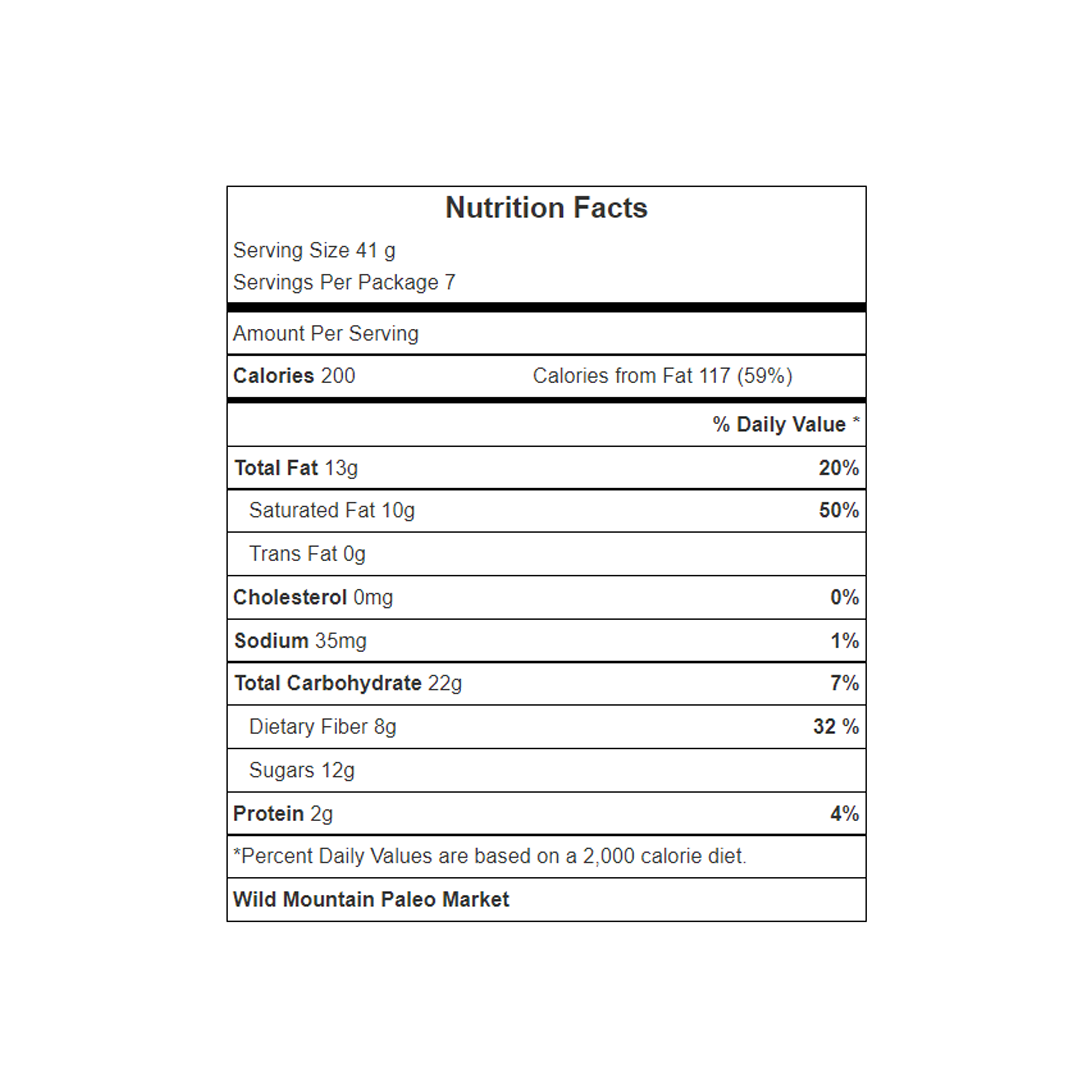 coco orgánico, chufas (Tigernuts) molidas orgánicas, pasas orgánicas (sin aceite agregado), azúcar de coco orgánico, canela orgánica, raíz de konjac, sal rosa del himalaya.