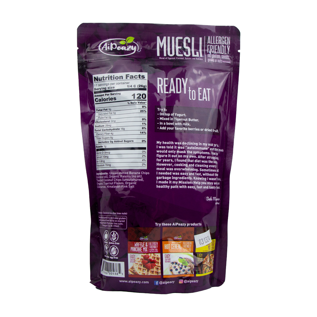 Cereal con una mezcla de chufas, coco, pasas y guineo. Libre de alérgenos , no contiene gluten, semillas, granos y nueces. Se puede consumir como cereal o como complemento sobre helados, yogurt, postres o frutas.