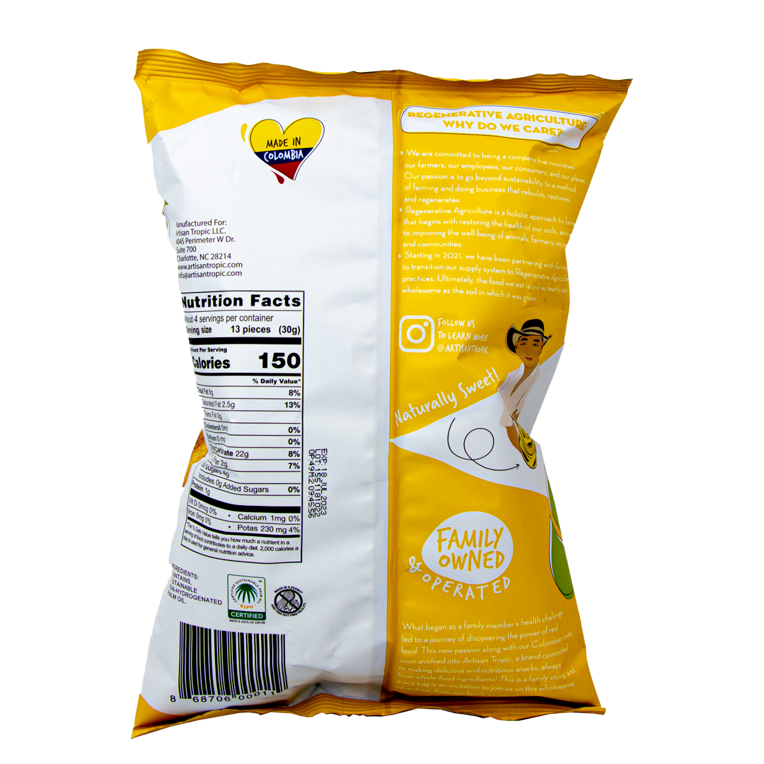 Los chips de plátano naturalmente dulces Artisan Tropic son un sabor de los trópicos. Brindan el crujido y la dulzura perfectos para una forma saludable de satisfacer ese gusto por lo dulce que todos llevamos dentro. Son perfectos solos, con un poco de helado de coco o con un increíble dip de coco, vainilla y almendras. Y no te preocupes por el contenido de azúcar, todo es natural, porque ¿por qué le agregaríamos azúcar a algo tan naturalmente dulce?