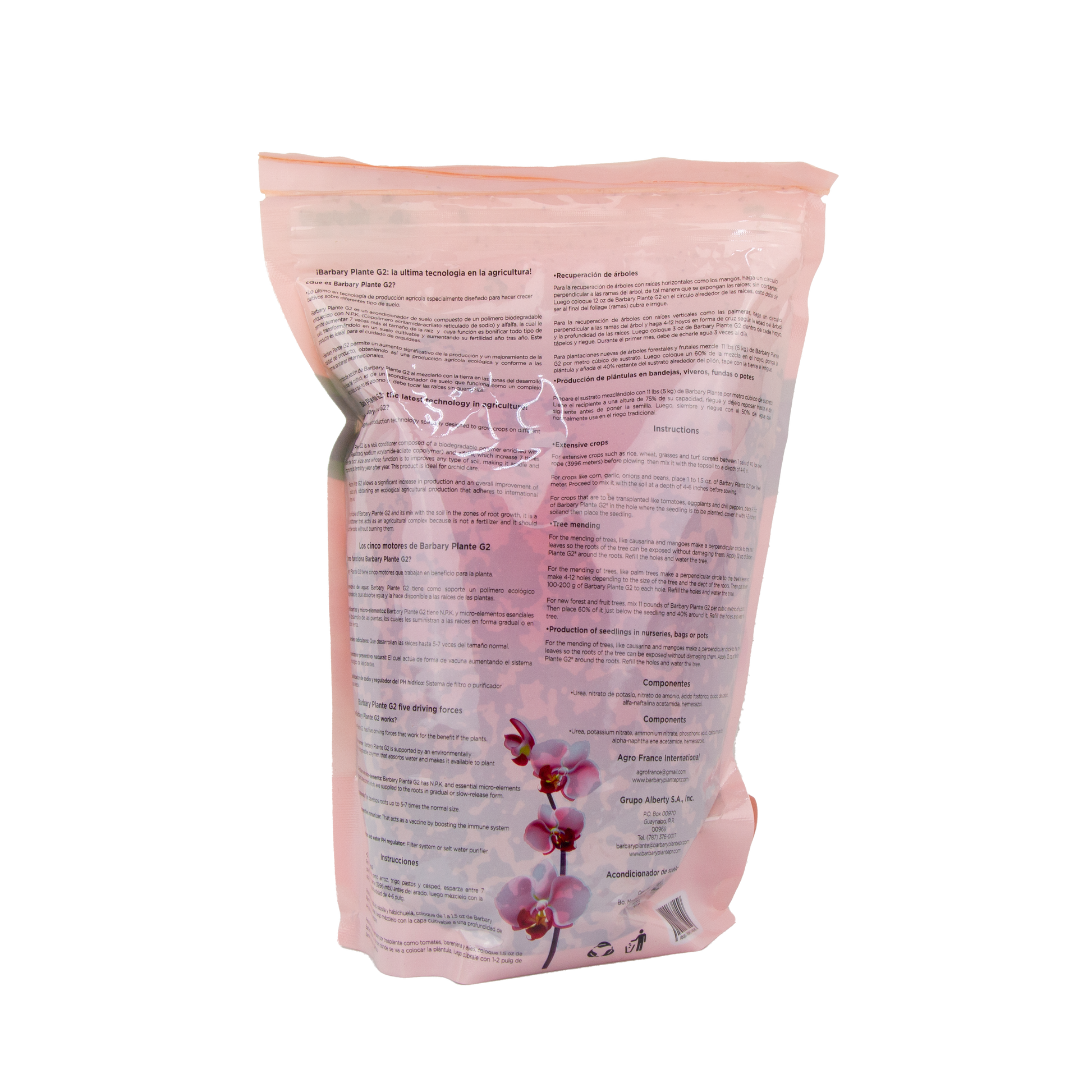 Barbary Plante G2 es un acondicionador de suelo compuesto de un polímero biodegradable enriquecido con N.P.K. (Copolímero acrilamida- acrilato reticulado de sodio) y alfalfa, la cual le permite aumentar 7 veces más el tamaño de la raíz y cuya función es bonificar todo tipo de suelo, transformándolo en un suelo cultivable y aumentando su fertilidad año tras año. Este producto es ideal para el cuidado de orquídeas.