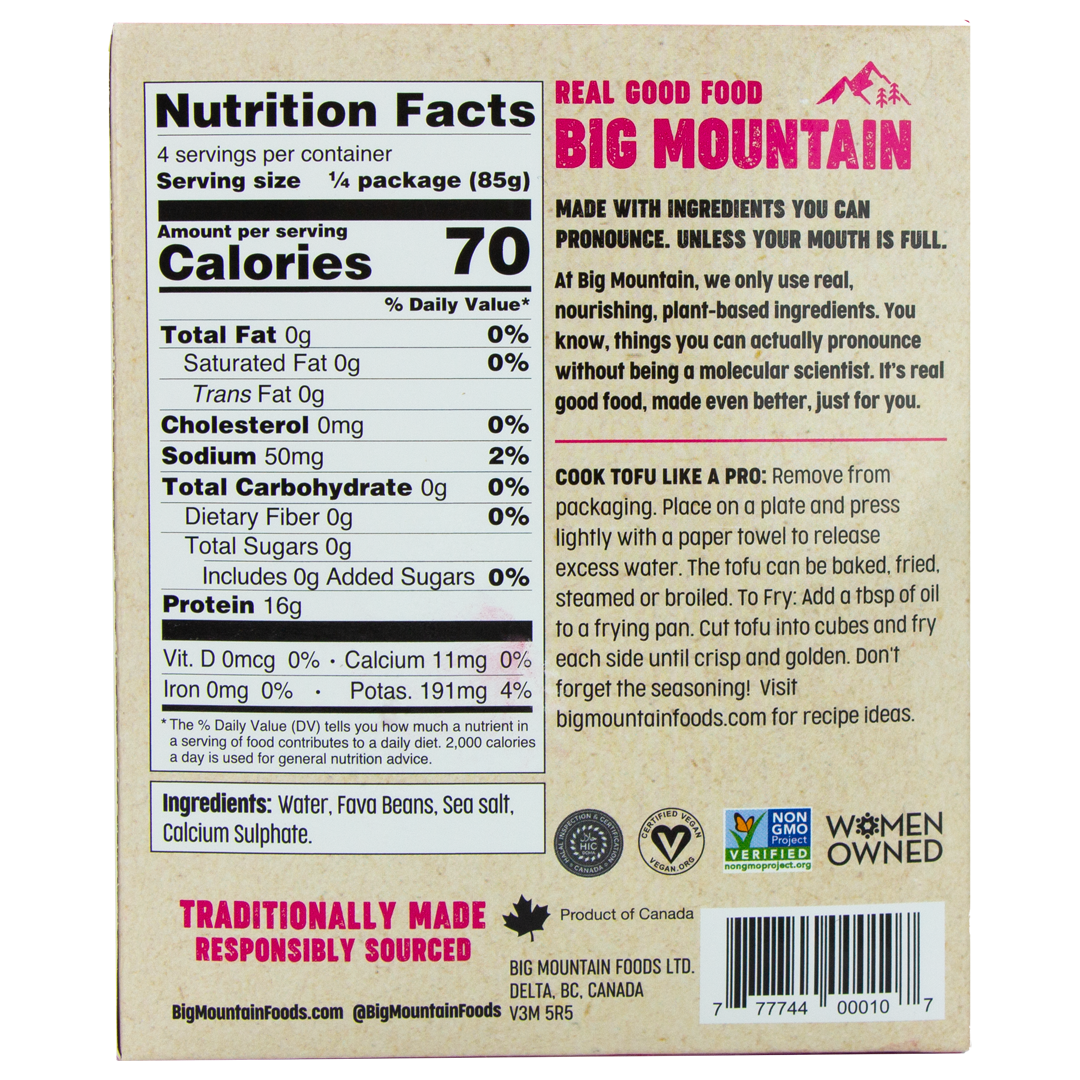 Una innovación pionera en el mercado, el tofu sin soya de Big Mountain Foods está hecho 100 % con habas canadienses y contiene tanta proteína que es EL superalimento de los superalimentos. De hecho, el tofu sin soya contiene un 95 % más de proteína que las principales marcas de tofu de soya, lo que lo convierte en la alternativa perfecta a la proteína de origen vegetal. Las habas contienen un poderoso golpe de bondad rico en fibra dietética, proteínas, vitaminas y minerales, y como todos los productos de Big Mountain Foods, el tofu sin soya es el complemento perfecto para cualquier comida, tiene un sabor delicioso y es realmente bueno para usted.