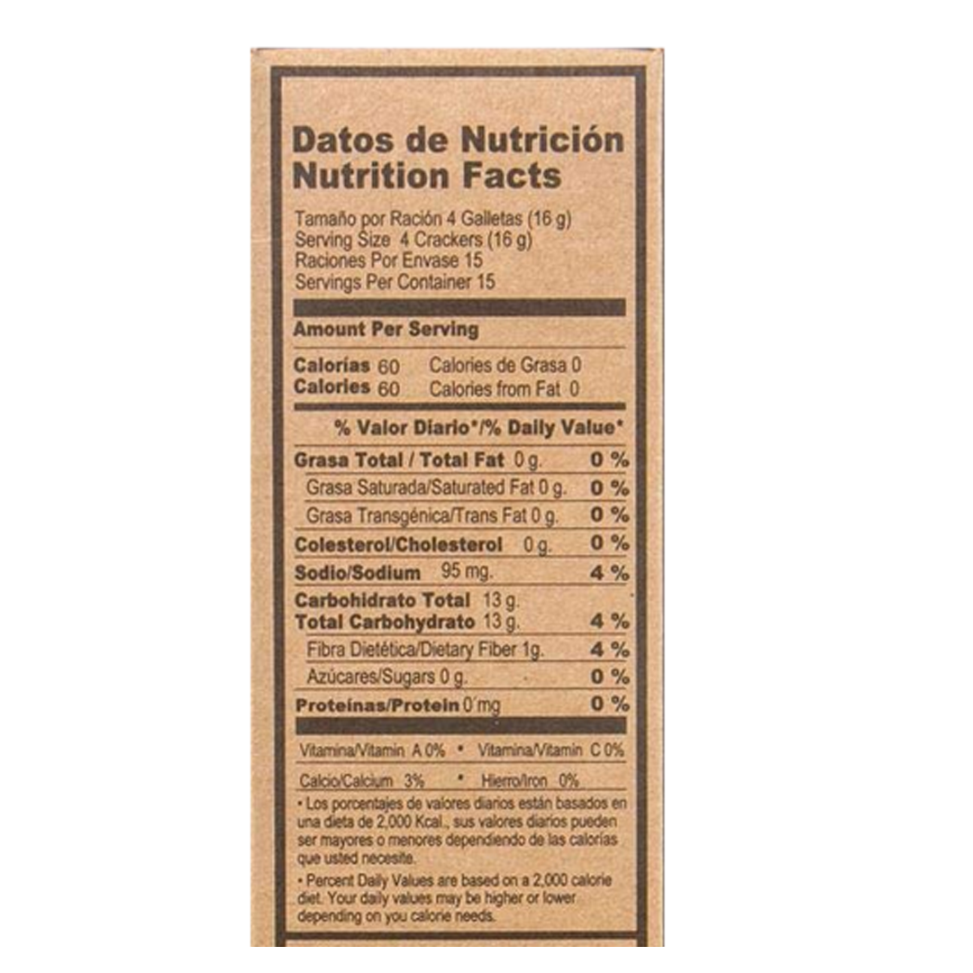 Galletas hechas con un solo ingrediente: yuca natural. Están libres de ingredientes artificiales y conservantes. No contienen gluten, trigo, grasa, colesterol, lactosa, nueces y no son transgénicos. Tienen un 4% de fibra y son ricas en enzimas.
