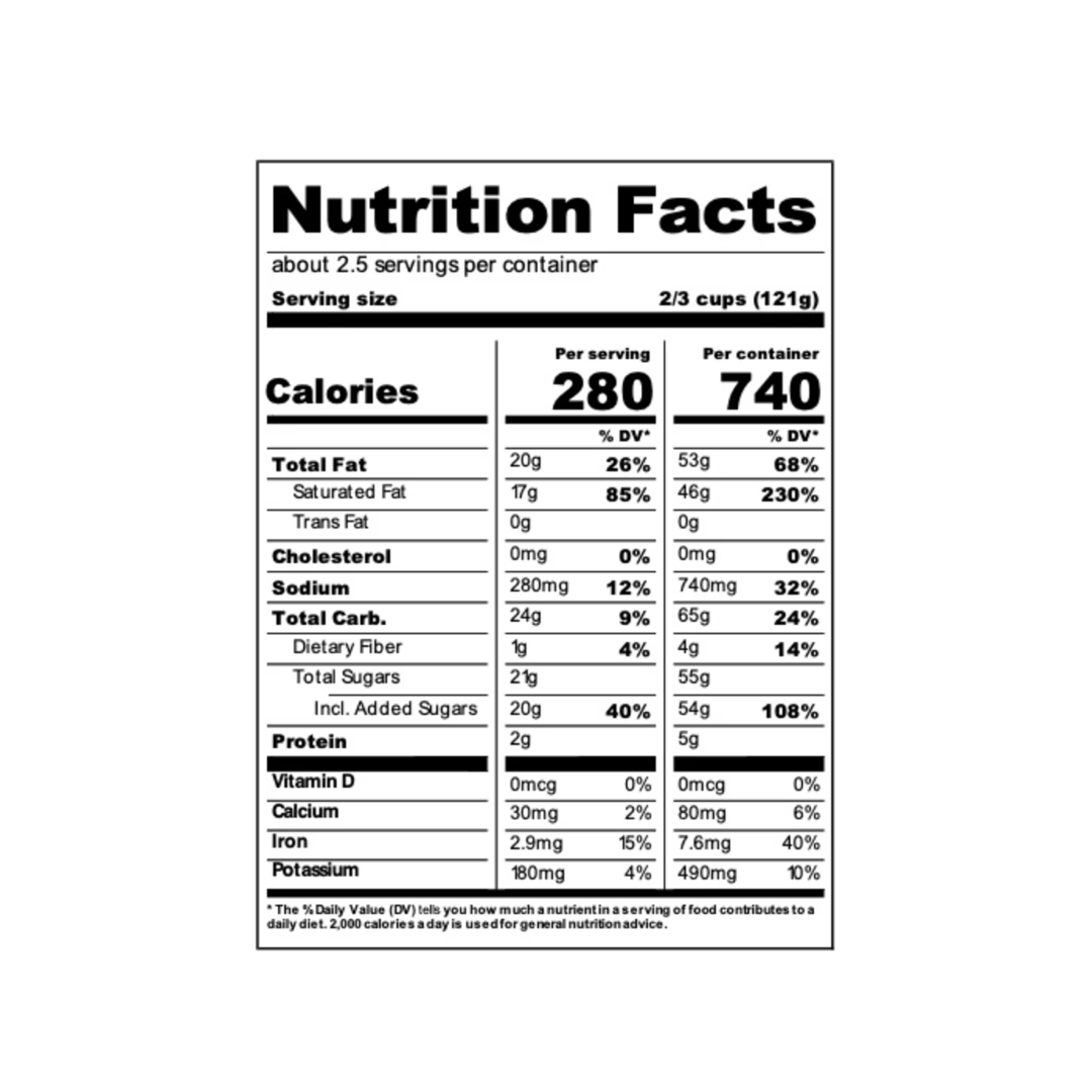 Leche de Coco (Agua, Coco, Goma Guar), Jarabe de Coco, Caramelo (Azúcar de Coco, Leche de Coco, Agua, Sal Marina, Goma Guar), Trozos de Chocolate Negro (Pasta de Cacao, Azúcar de Coco, Manteca de Cacao), Crema de Coco, Sal Marina.