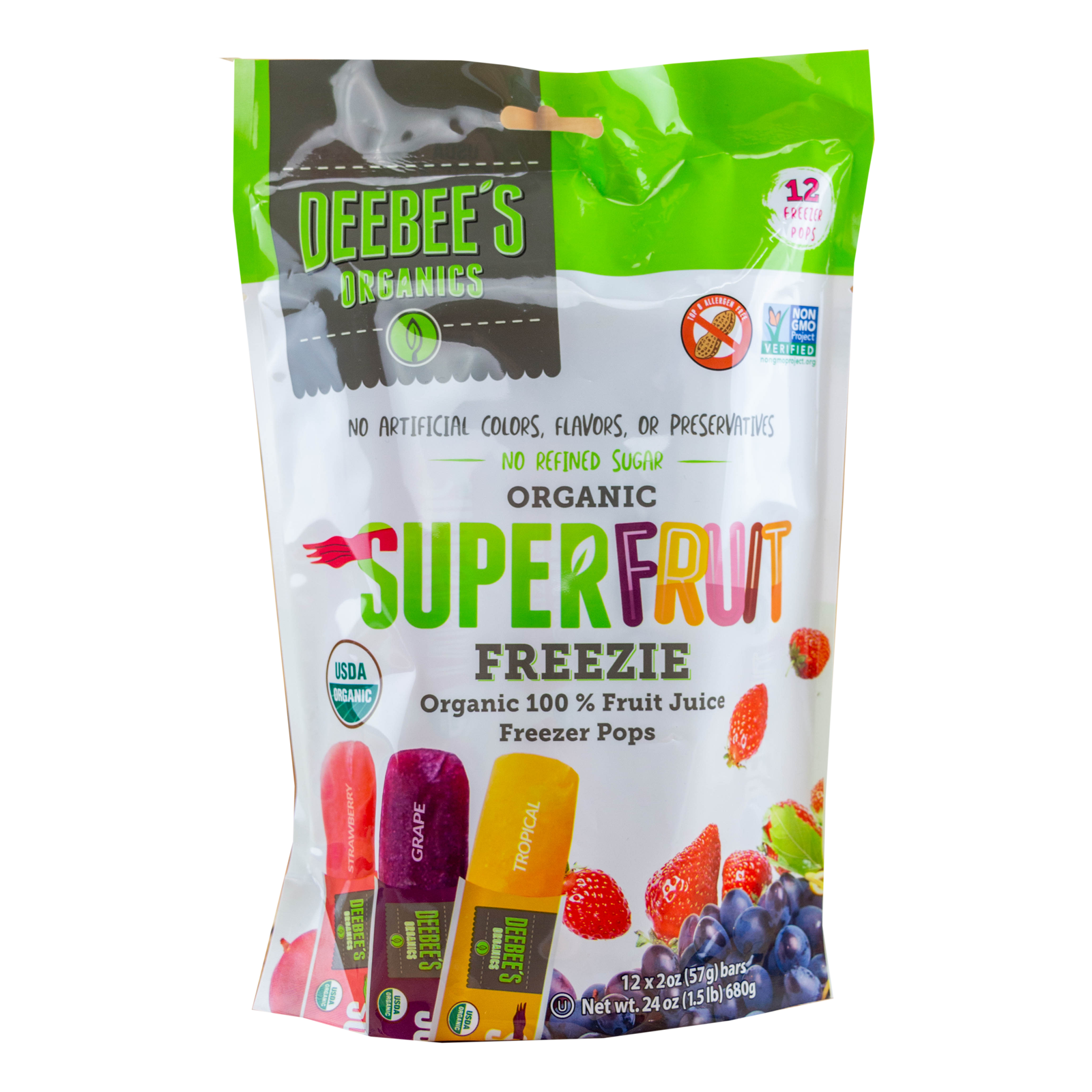 Son la primera barra de jugos orgánicos congelados en el hogar que no tiene azúcares agregados, sabores artificiales, colorantes ni conservantes. En cada bolsa obtendrás tres sabores deliciosos que toda la familia disfrutará: ¡Tropical, fresa y uva! Los Super Fruit Freezies de DeeBee Organics también están libres de los 8 alérgenos principales: maní, nueces, leche, huevos, pescado, mariscos, soya, seasame y trigo.