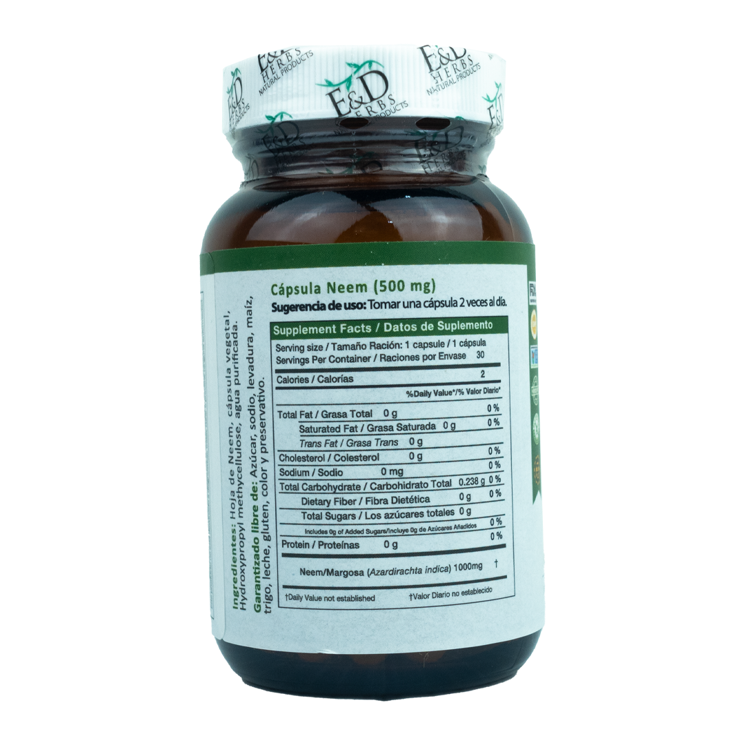 Neem (Azadirachta indica), es una de las hierbas más valoradas en la medicina india y ayurvédica. Es un árbol caducifolio de hasta 16 metros de altura nativo de la India, Sri Lanka, Pakistán e Irán. Sus hojas son compuestas, alternas, oblongas, ovadas-lanceoladas y puntiagudas. La corteza es marrón grisáceo, fisurada externamente y tiene una superficie interna de pulido y fractura fibrosa. Sus flores son pequeñas, de color blanco. Con fines medicinales se utilizan la corteza, las hojas, las ramas, las semillas y el látex.