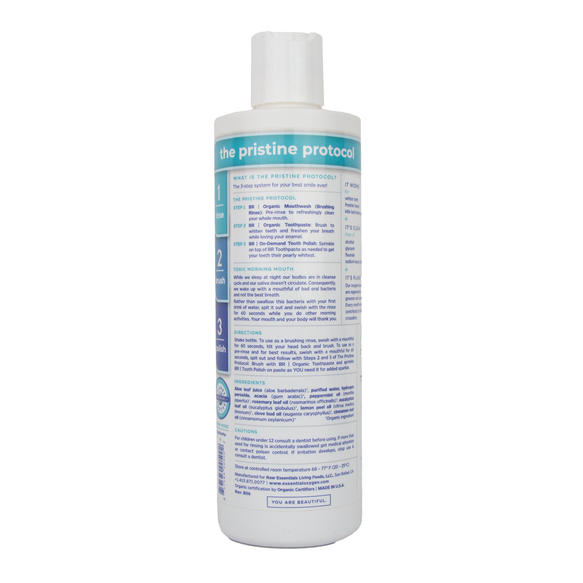 Jugo de hoja de aloe (aloe barbadensis)*, agua purificada, peróxido de hidrógeno, acacia (goma arábiga)*, aceite de menta (mentha piperita)*, aceite de hoja de romero (rosmarinus officinalis)*, aceite de hoja de eucalipto (eucalyptus globulus)*, cáscara de limón (citrus medica limonum)*, aceite de yema de clavo (eugenia caryophyllus)*, aceite de hoja de canela (cinnamomum zeylanicum)*