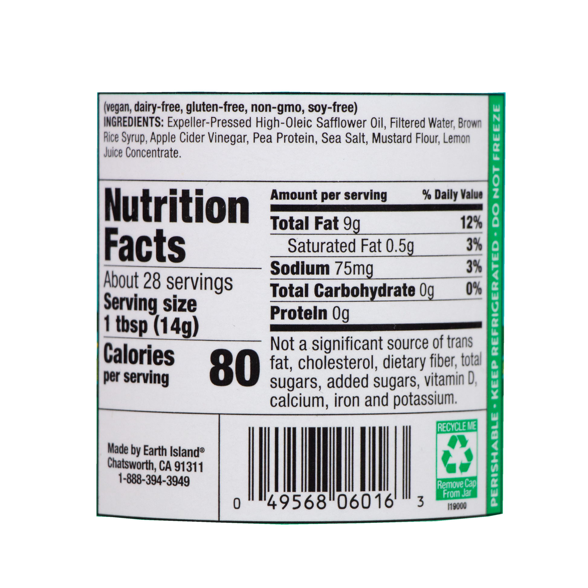 Aceite de cártamo alto en oleico prensado por expulsor, agua filtrada, jarabe de arroz integral, vinagre de sidra de manzana, proteína de guisante, sal marina, harina de mostaza, concentrado de jugo de limón.