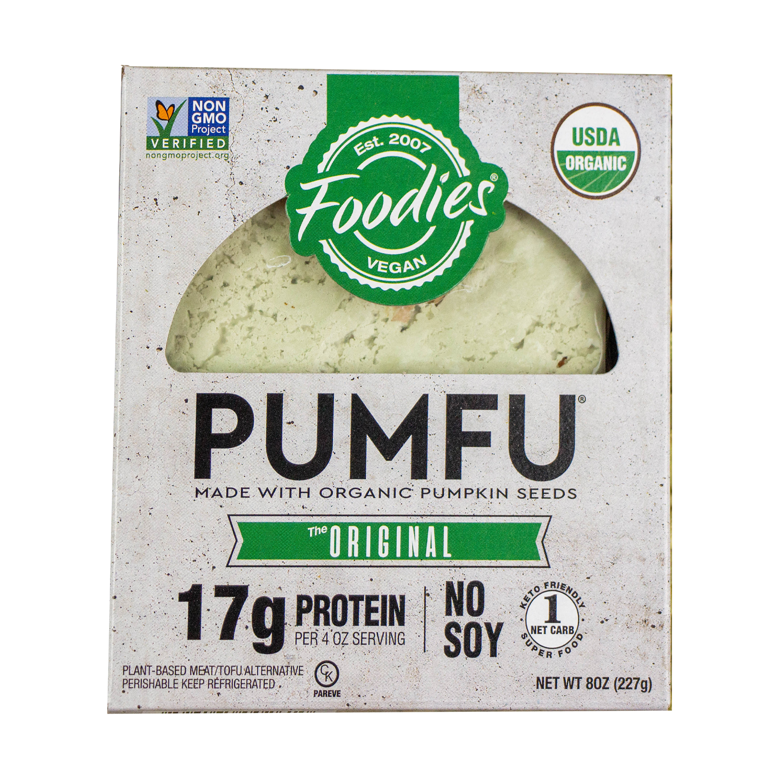 Pumfu es una proteína vegetal, hecha de semillas de calabaza orgánicas. ¡Es una alternativa increíble a la carne, el tofu, los huevos, el queso y más! Tiene un sabor a nuez suave, una textura firme y adquiere un sabor muy particular.