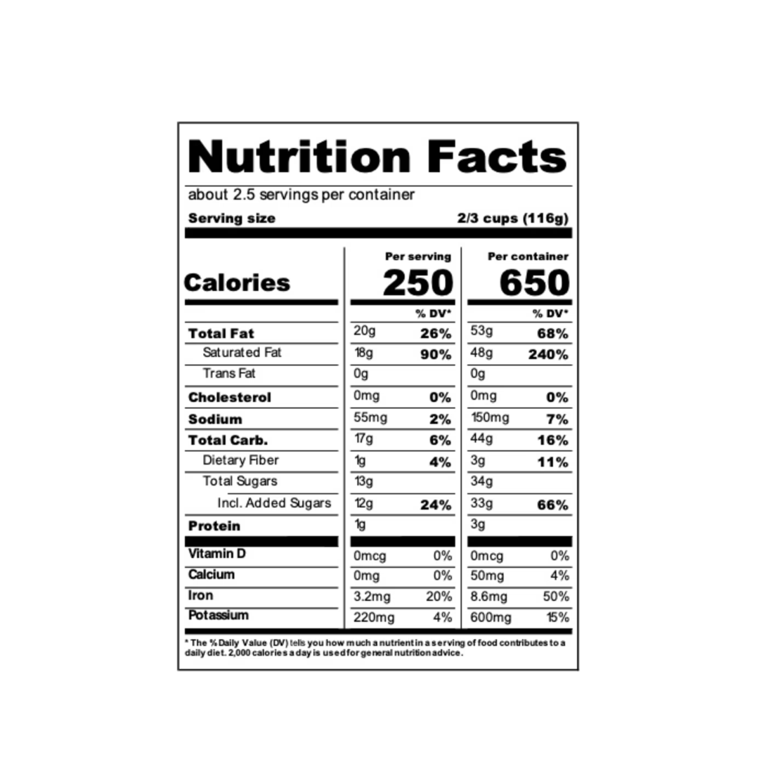 Leche de Coco (Agua, Coco, Goma Guar), Jarabe de Coco, Crema de Coco, Extracto de Vainilla, Vainilla en Grano.