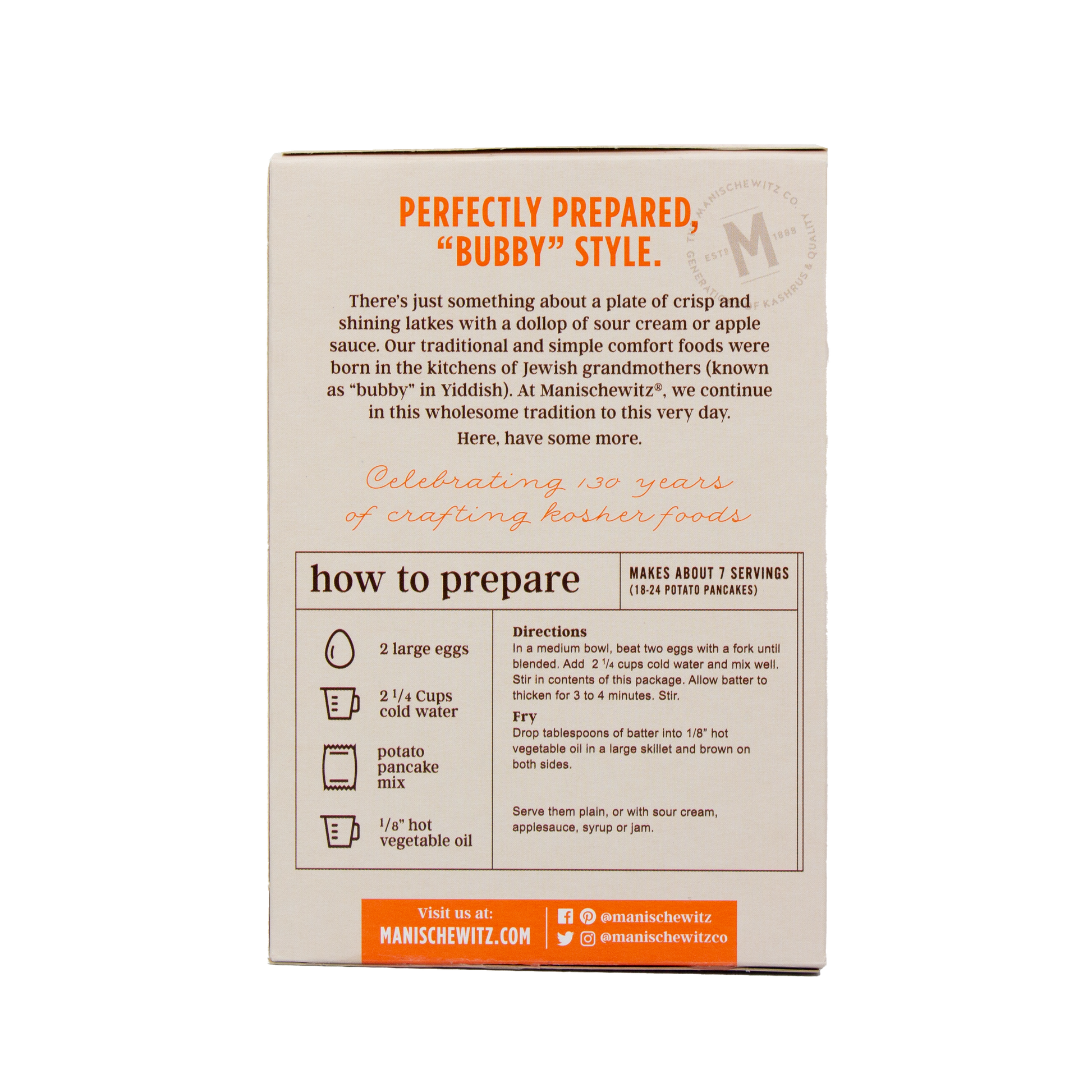 Las tortitas de patata Manischewitz son un clásico desde hace mucho tiempo en las mesas festivas y cenas estadounidenses. ¡Disfruta de los panqueques al estilo tradicional de Manischewitz tal como los hacía Bubby! ¡Nuestros panqueques no contienen gluten ni glutamato monosódico y no tienen sabores ni colorantes artificiales añadidos!