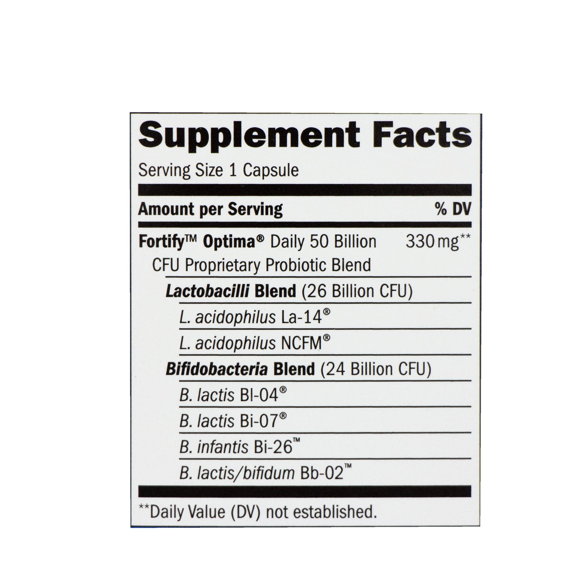 Fortify Optima mezcla patentada de 50 mil millones de UFC; Probióticos Lactobacilli HDS, L. acidophilus HDS (La-14), L. acidophilus HDS (NCFM); Bifidobacterias HDS probióticos, B. lactis HDS (Bl-04), B. lactis HDS (Bi-07), B. infantis HDS (Bi-26), B. lactis / bifidum HDS (Bb-02); Celulosa; Cápsula de origen vegetal (hipromelosa; goma gellan); Estearato de magnesio; Sílice