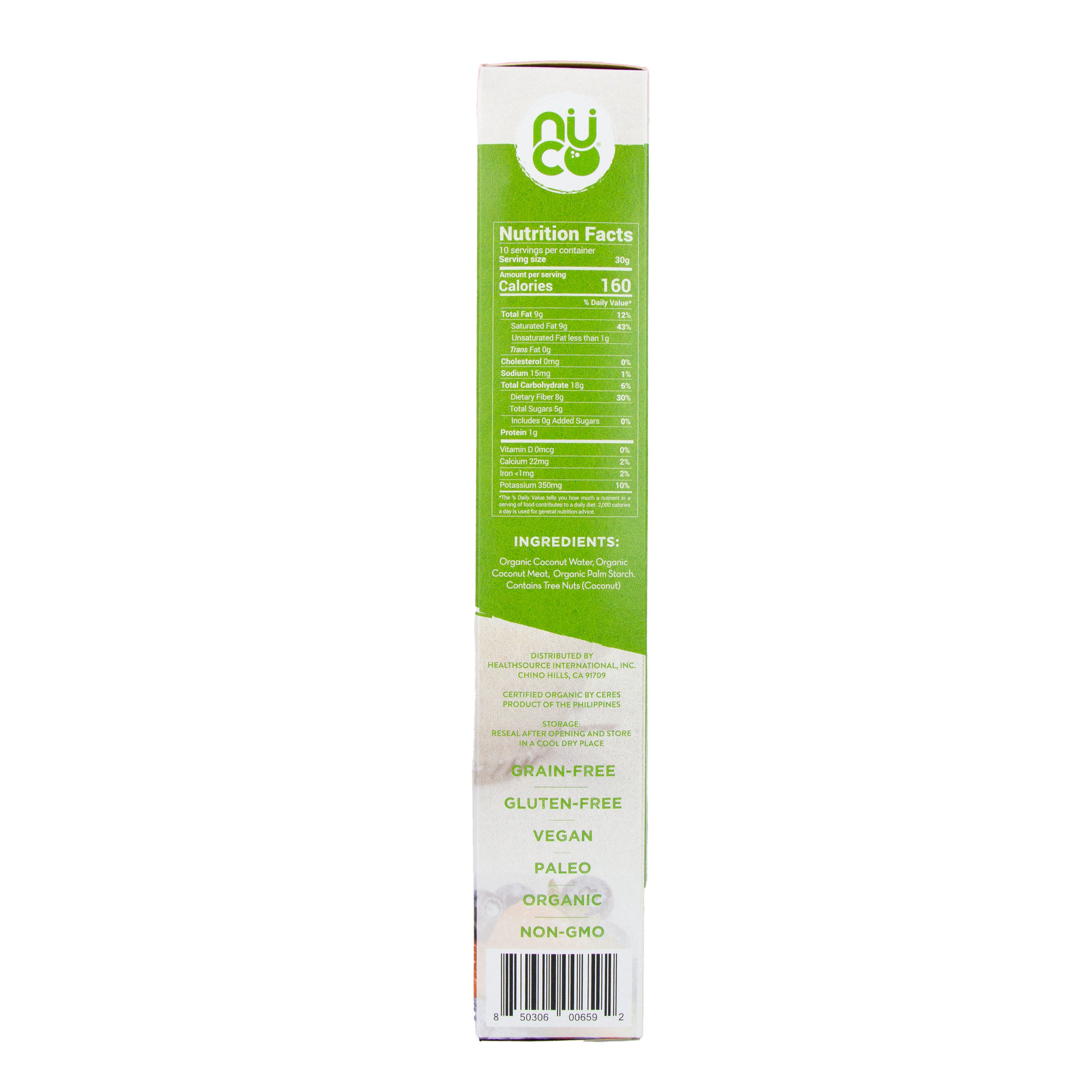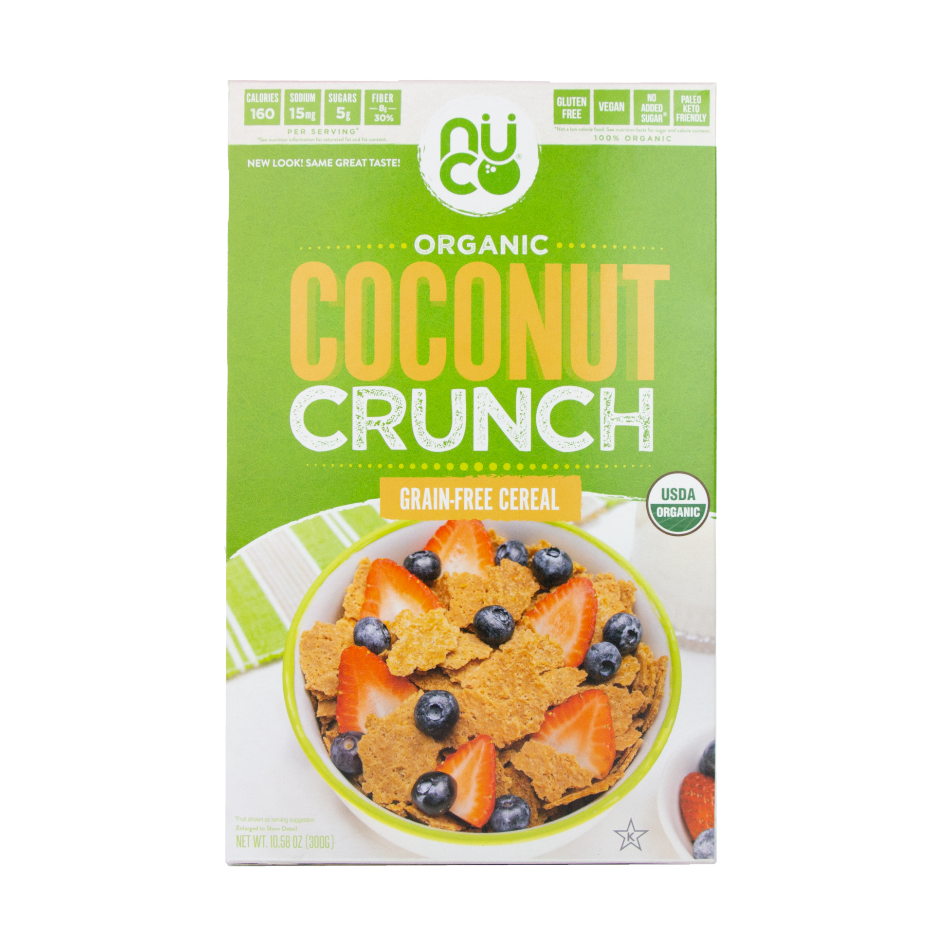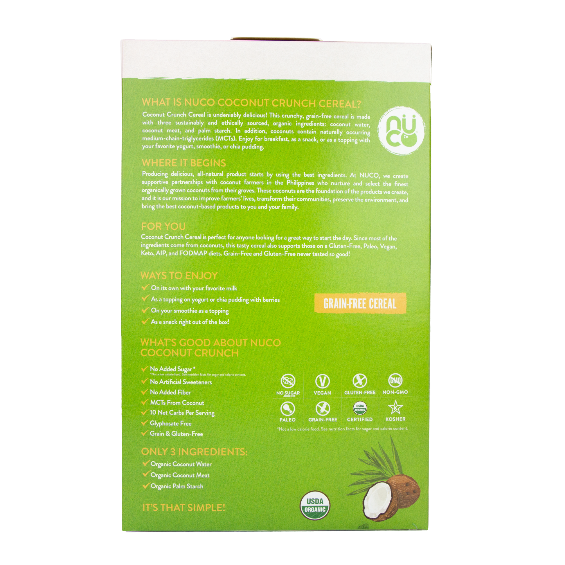 Cereal frío de coco libre de gluten. Solo tres ingredientes componen esta maravillosa alternativa para desayunos y meriendas: Agua de coco, carne de coco y almidón de palma. 100% Delicioso, vegano, certificado orgánico y Kosher.