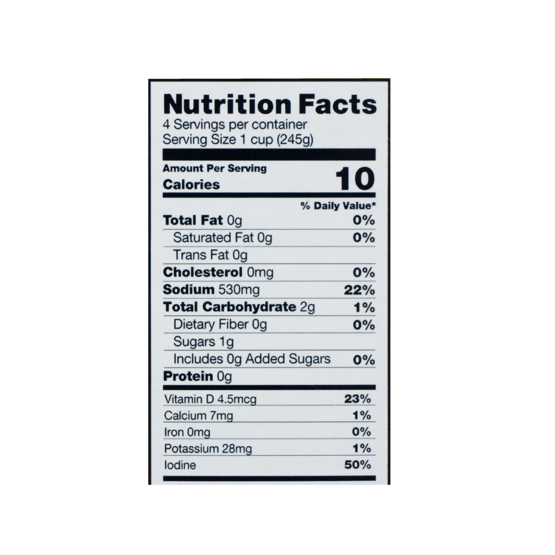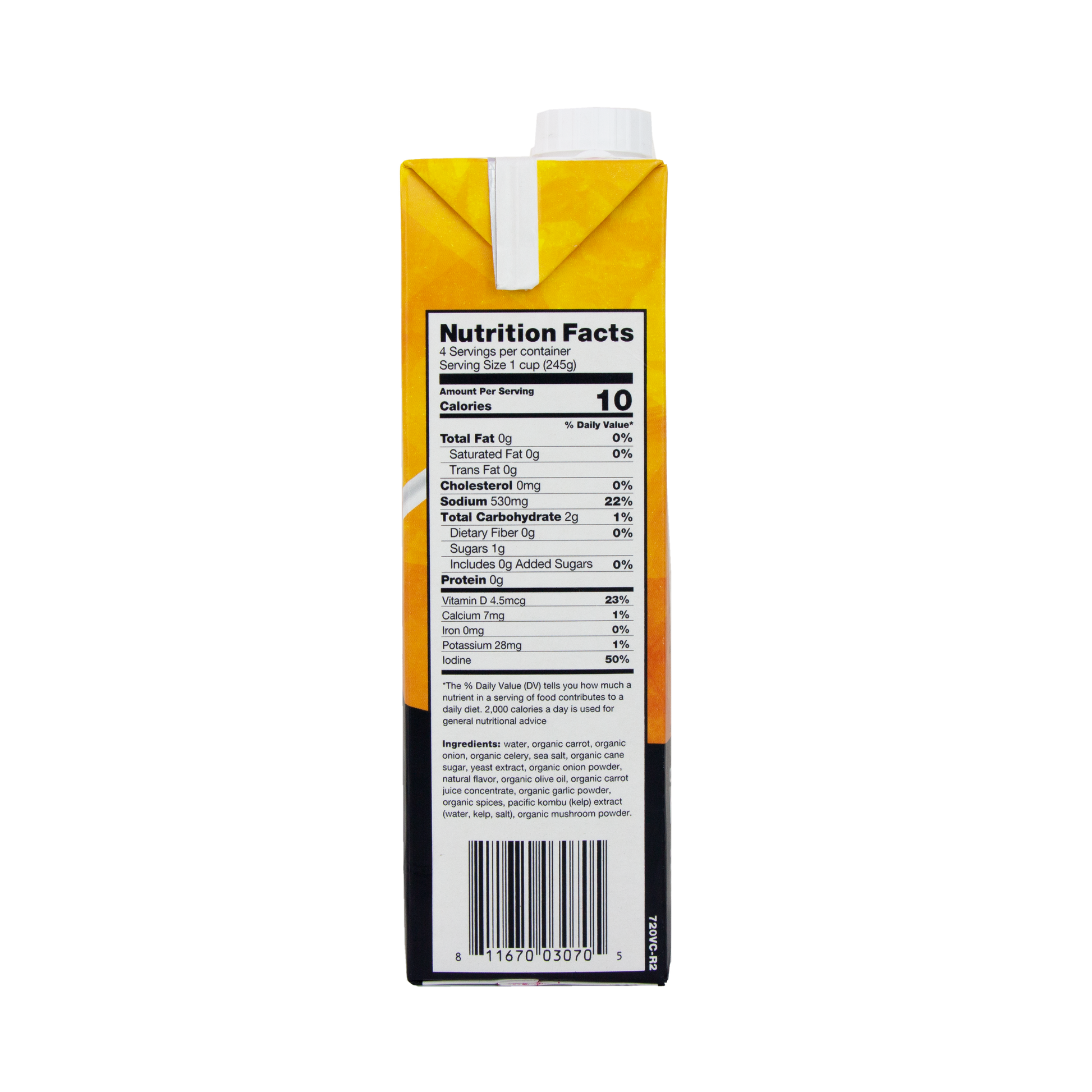 Agua, zanahoria orgánica, cebolla orgánica, apio orgánico, sal marina, azúcar de caña orgánica, extracto de levadura, polvo de cebolla orgánica, sabor natural, aceite de oliva orgánico, concentrado de jugo de zanahoria orgánico, ajo en polvo orgánico, especias orgánicas, extracto de kombu del Pacífico (kelp) (agua, algas marinas, sal), polvo de hongos orgánicos.