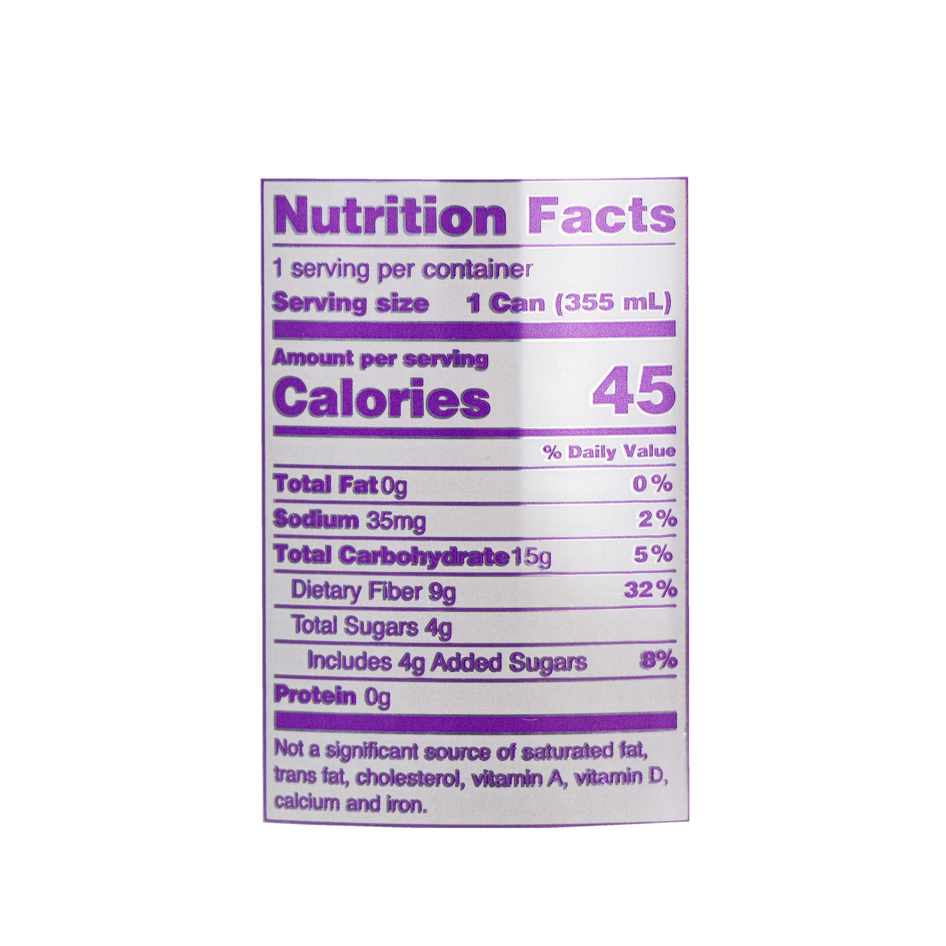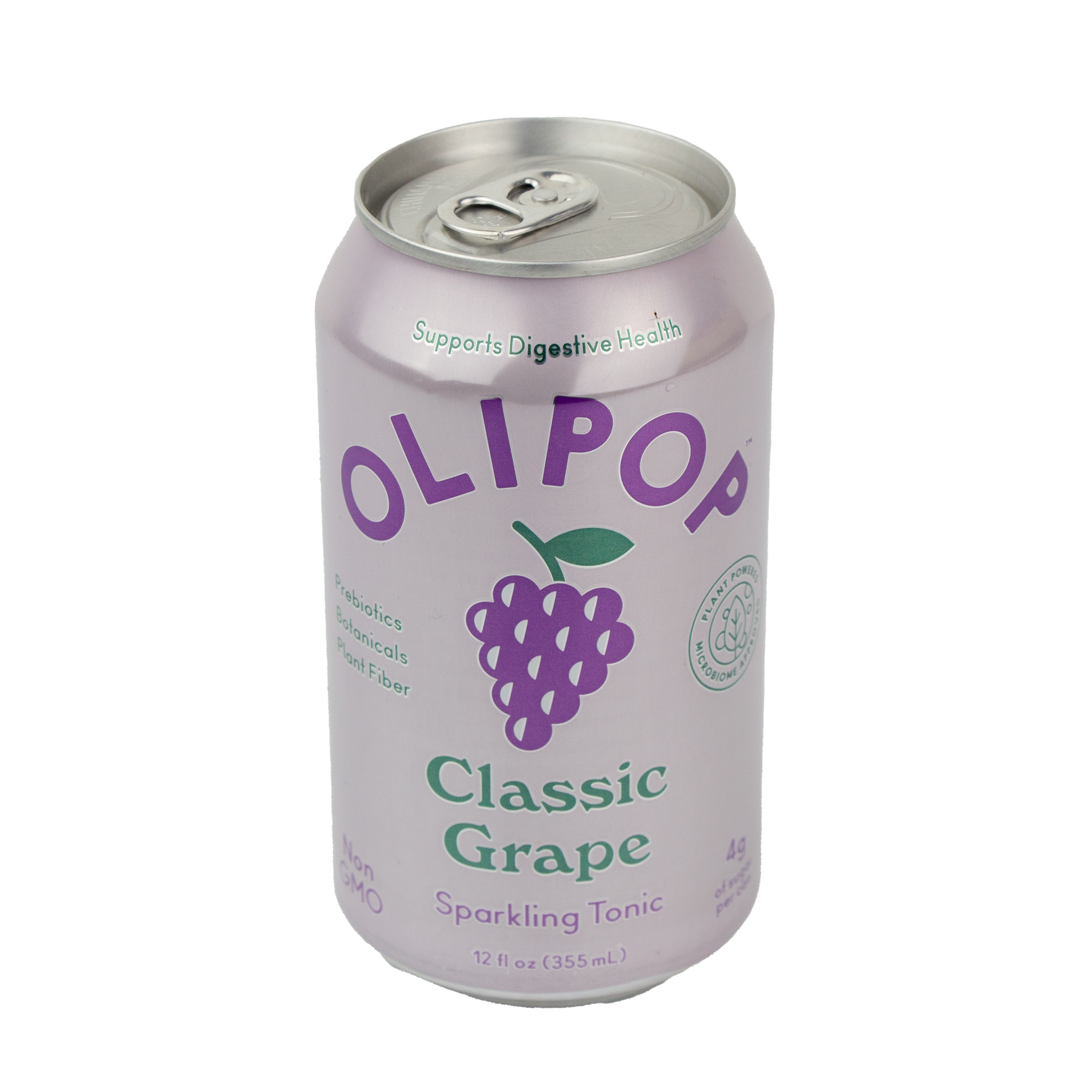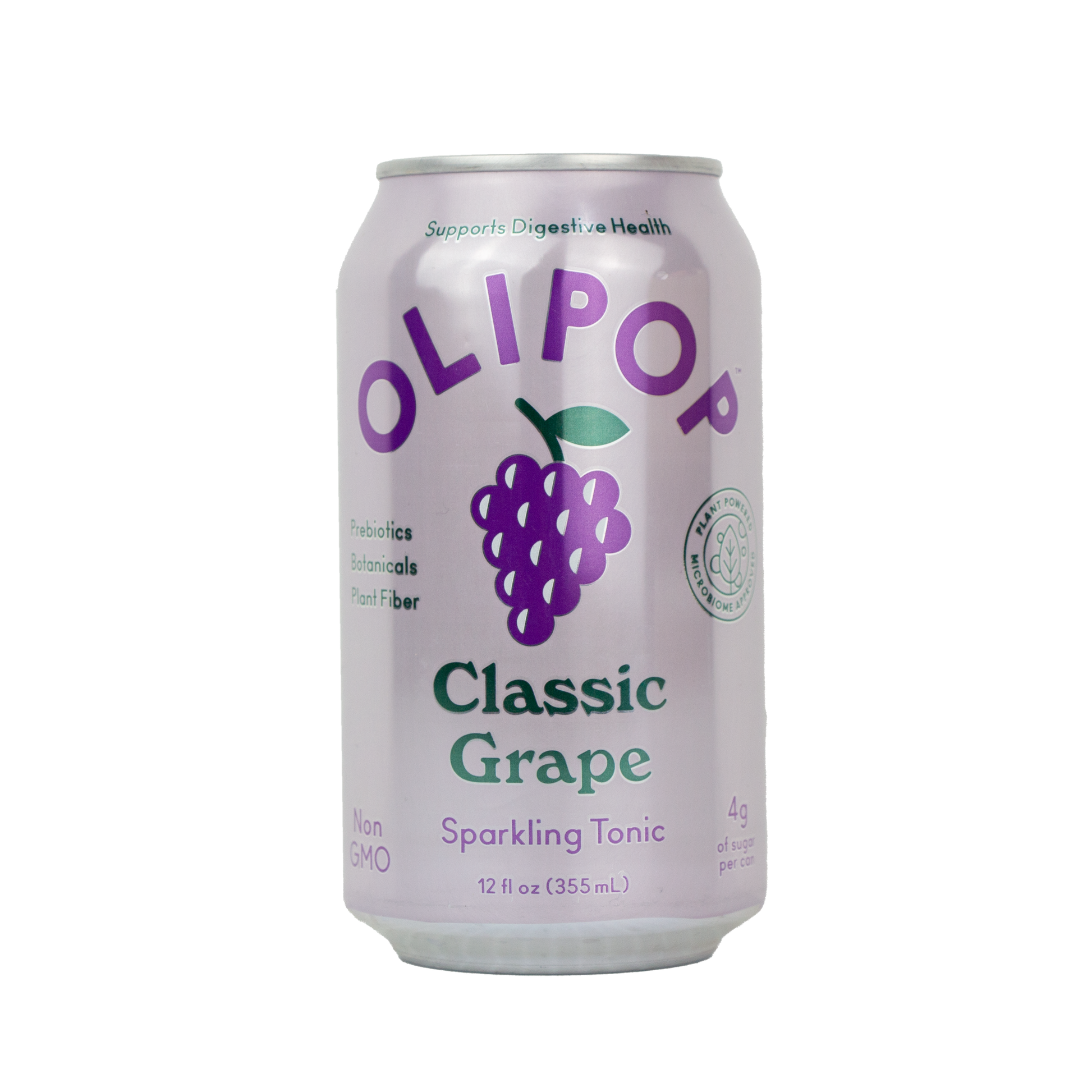 Agua carbonatada, OLISMART (fibra de raíz de yuca, inulina de raíz de achicoria, inulina de alcachofa de Jerusalén, corteza de olmo resbaladizo, nopal*, raíz de malvavisco*, flor de caléndula*, raíz de kudzu*), concentrado de jugo de uva Concord, jugo de lima, concentrado de jugo de manzana, Jarabe de raíz de mandioca, ácido tartárico (de uva), hoja de stevia*, sal rosa del Himalaya, sabor natural a uva