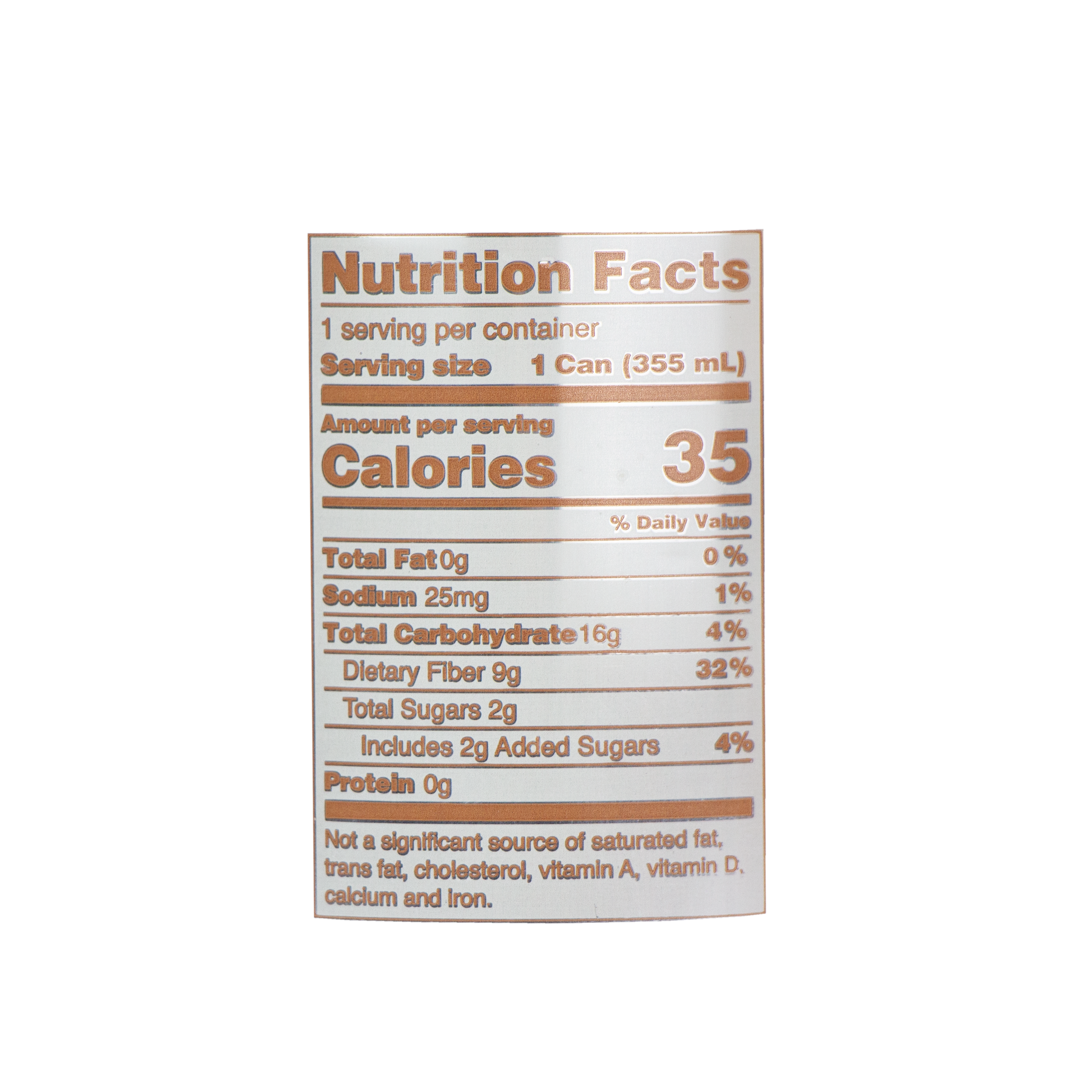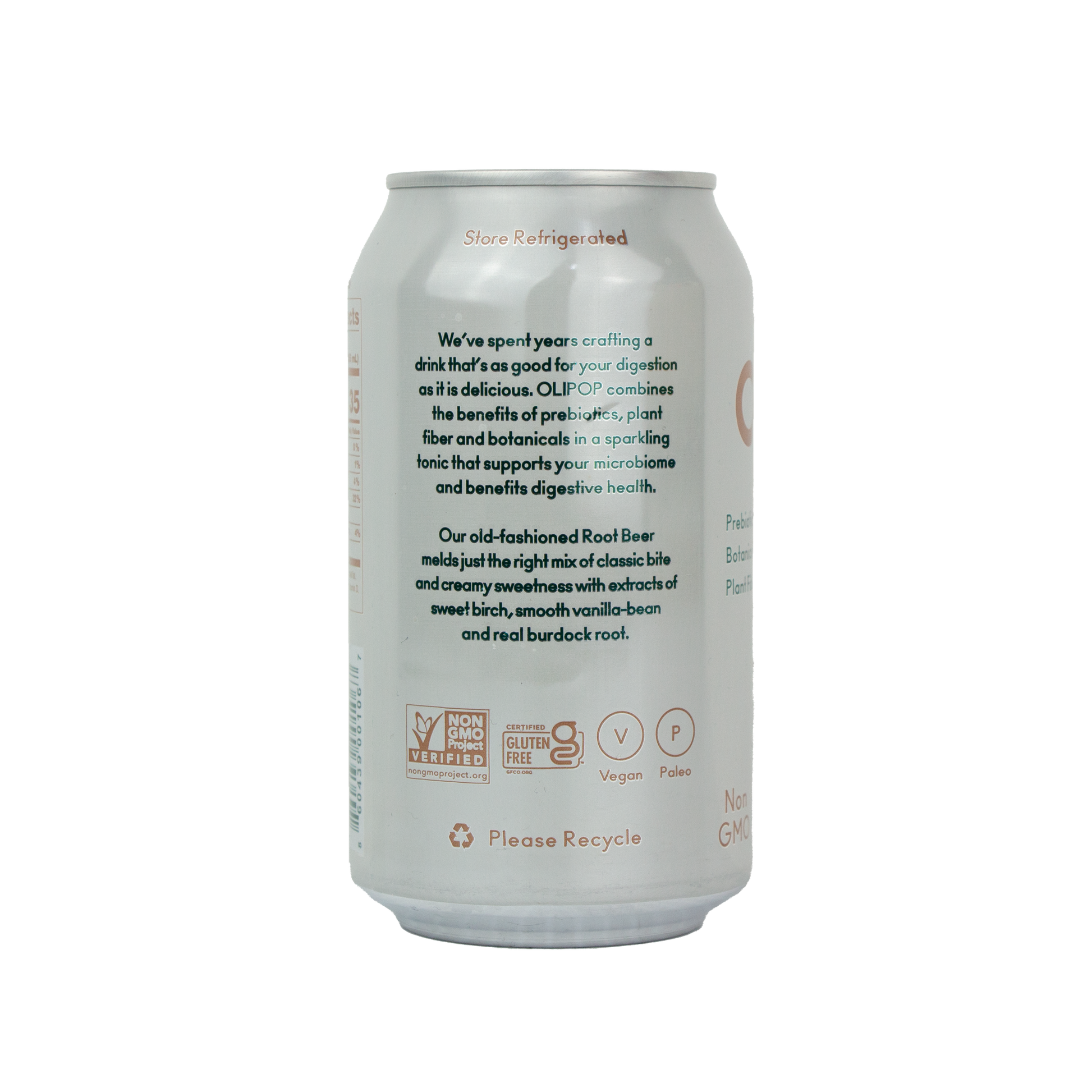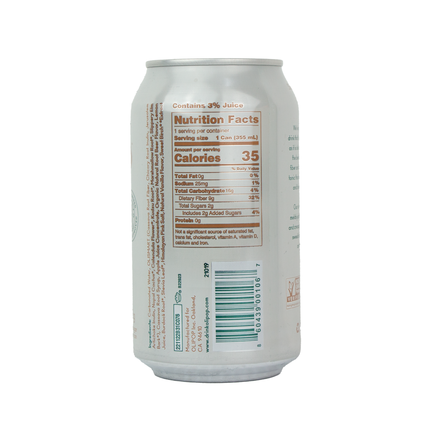 Ingredientes: agua carbonatada, OLISMART (fibra de raíz de yuca, inulina de raíz de achicoria, inulina de alcachofa de Jerusalén, corteza de olmo resbaladizo, nopal*, raíz de malvavisco*, flor de caléndula*, raíz de kudzu*), jarabe de raíz de yuca, concentrado de jugo de manzana, raíz natural Sabor a cerveza, jugo de limón, raíz de bardana*, hoja de stevia*, sal rosa del Himalaya, sabor a vainilla natural, abedul dulce*