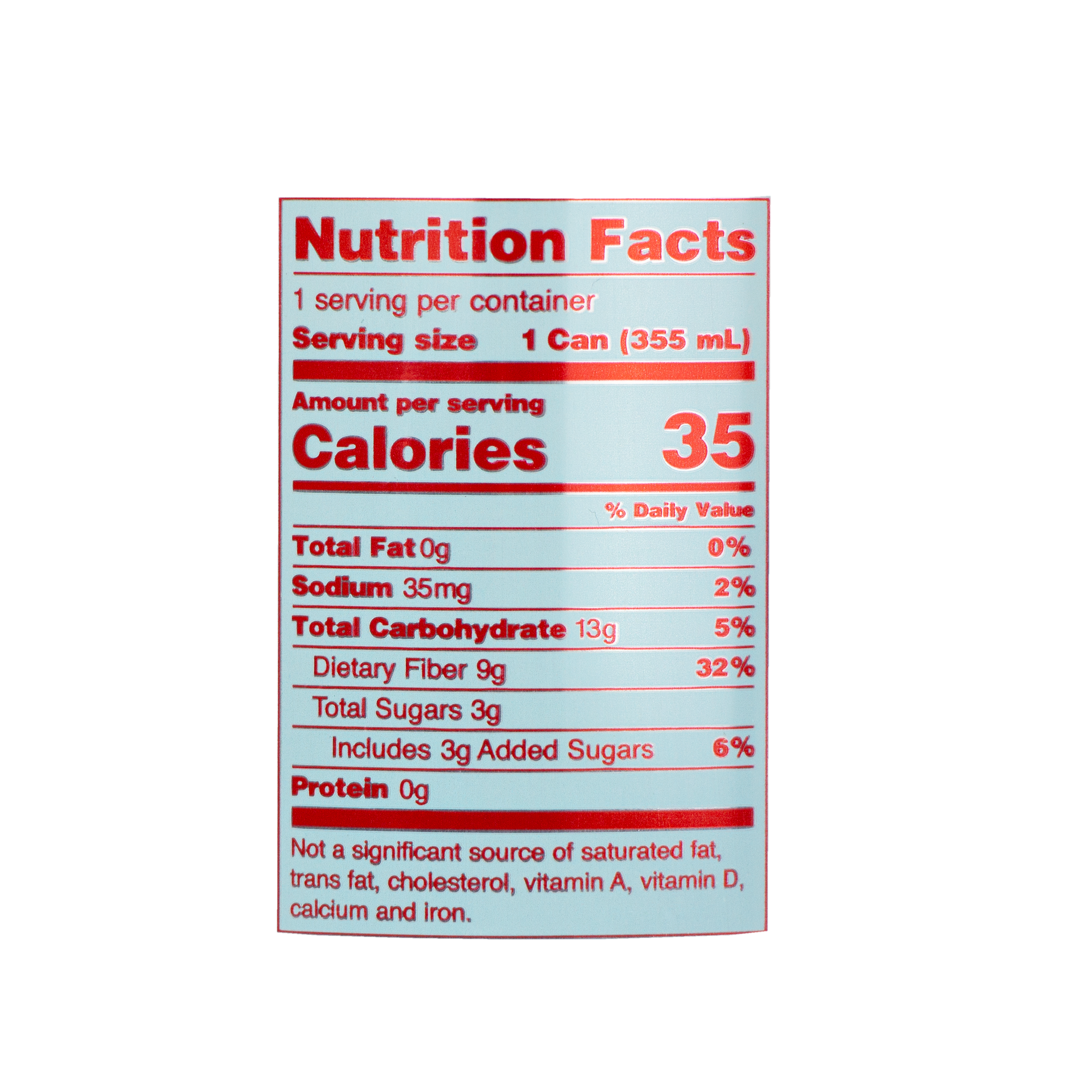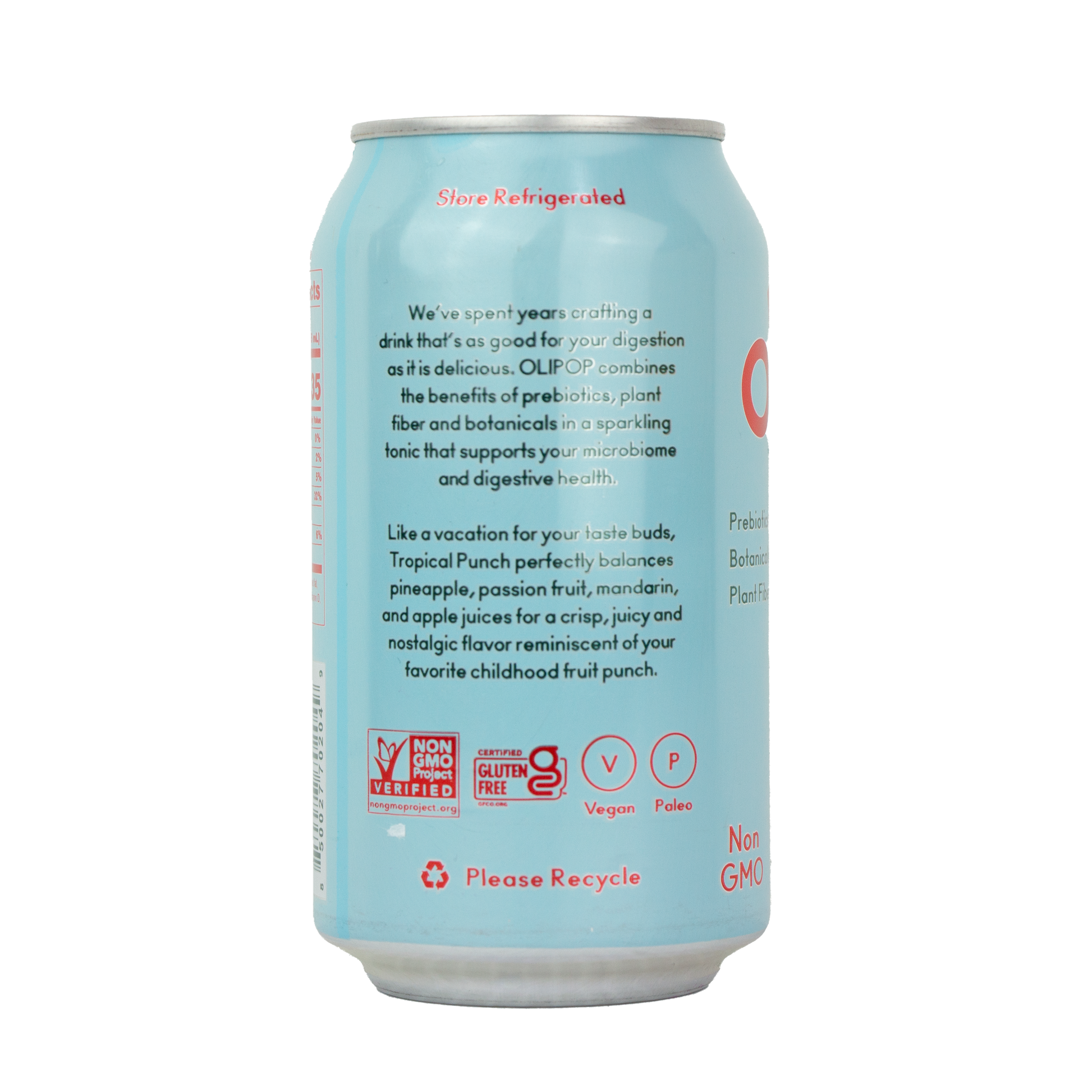 Agua carbonatada, OLISMART (fibra de raíz de yuca, inulina de raíz de achicoria, inulina de alcachofa de Jerusalén, corteza de olmo resbaladizo, nopal*, raíz de malvavisco*, flor de caléndula*, raíz de kudzu*), jugo de limón, jugo de piña concentrado, jugo de maracuyá concentrado, Concentrado de jugo de manzana, jarabe de raíz de mandioca, concentrado de jugo de mandarina, hoja de stevia*, sal rosa del Himalaya, sabor a ponche de frutas natural
