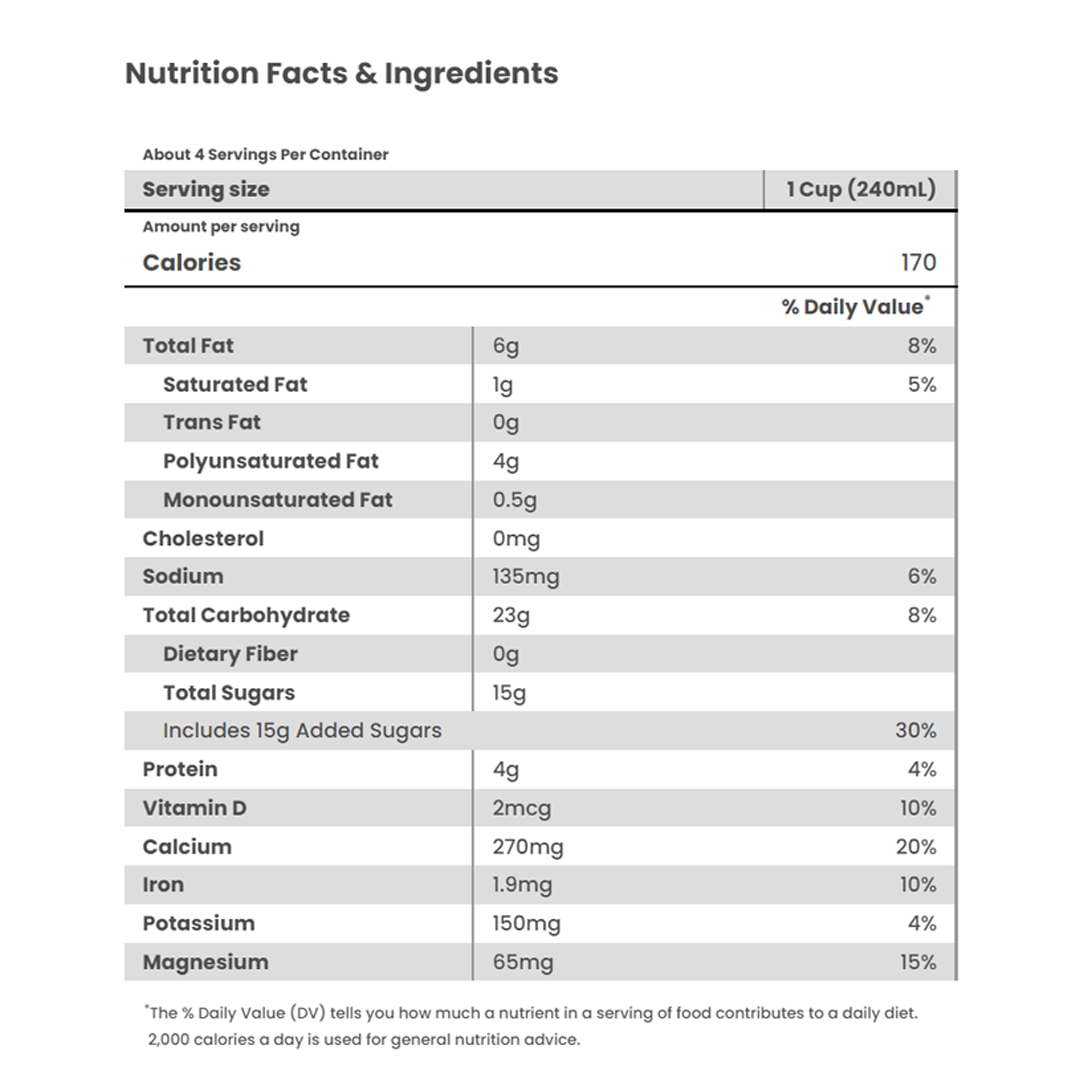 Agua, jarabe de arroz integral, semillas de cáñamo descascarilladas, contiene 1 % o menos de: fosfato disódico, sabor natural a vainilla con otros sabores naturales, fosfato tricálcico, vitamina D2, goma xantana.