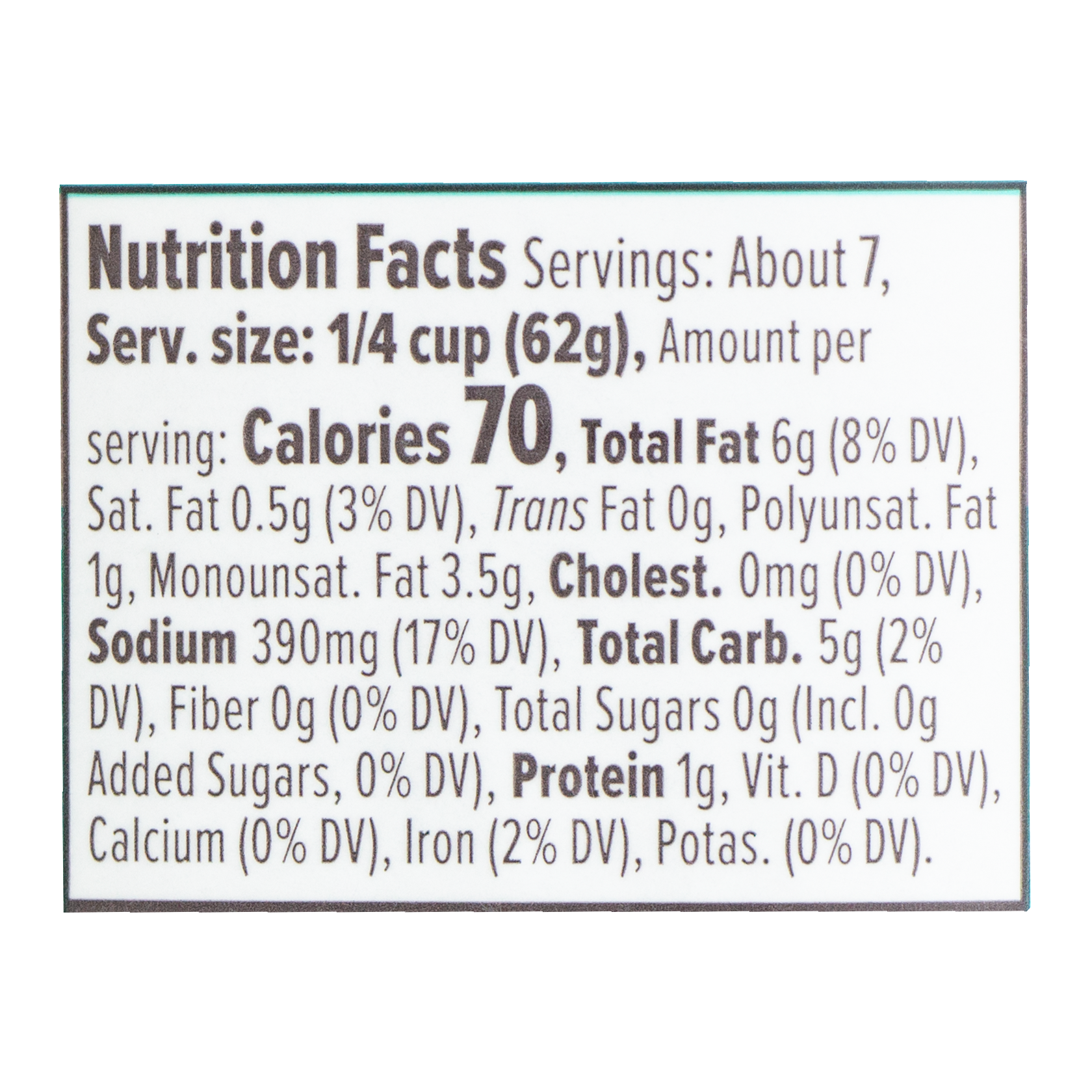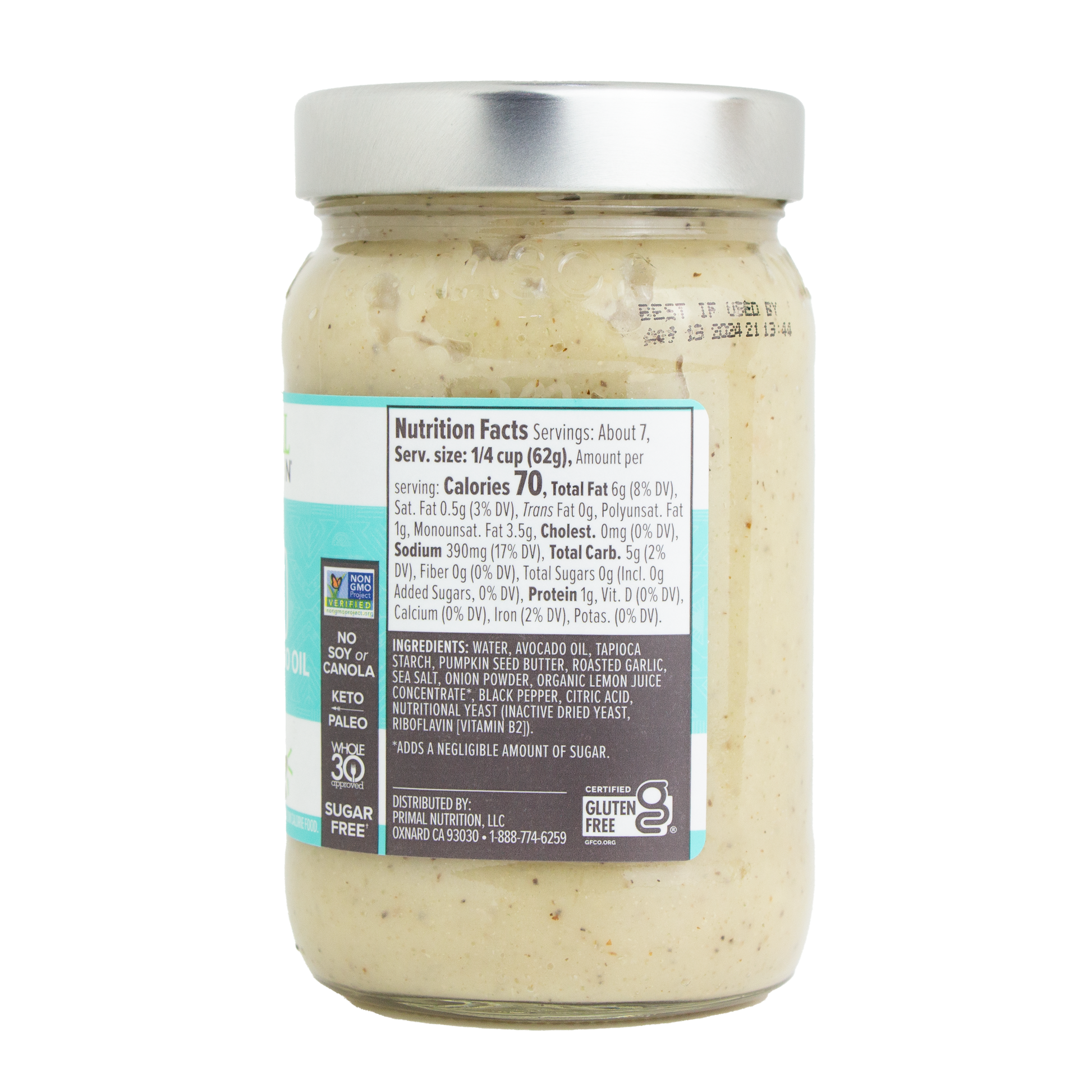 Agua, aceite de aguacate, almidón de tapioca, mantequilla de semillas de calabaza, ajo asado, sal marina, cebolla en polvo, concentrado de jugo de limón orgánico*, pimienta negra, ácido cítrico, levadura nutricional (levadura seca inactiva, riboflavina [vitamina B2]).