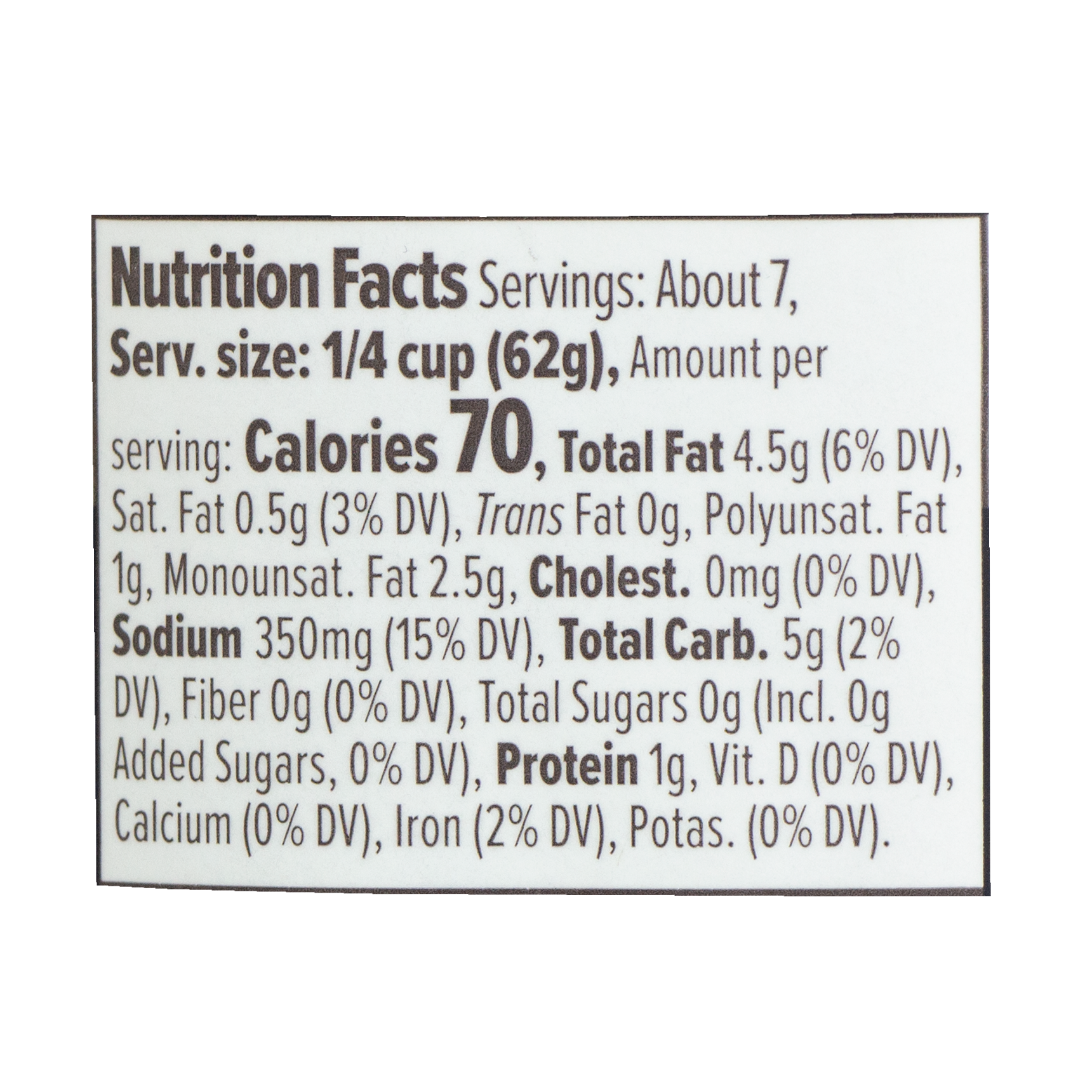 Agua, mantequilla de semillas de calabaza, aceite de aguacate, almidón de tapioca orgánico, ajo asado, sal marina, cebolla en polvo, concentrado de jugo de limón orgánico*, pimienta negra, ácido cítrico, levadura nutricional