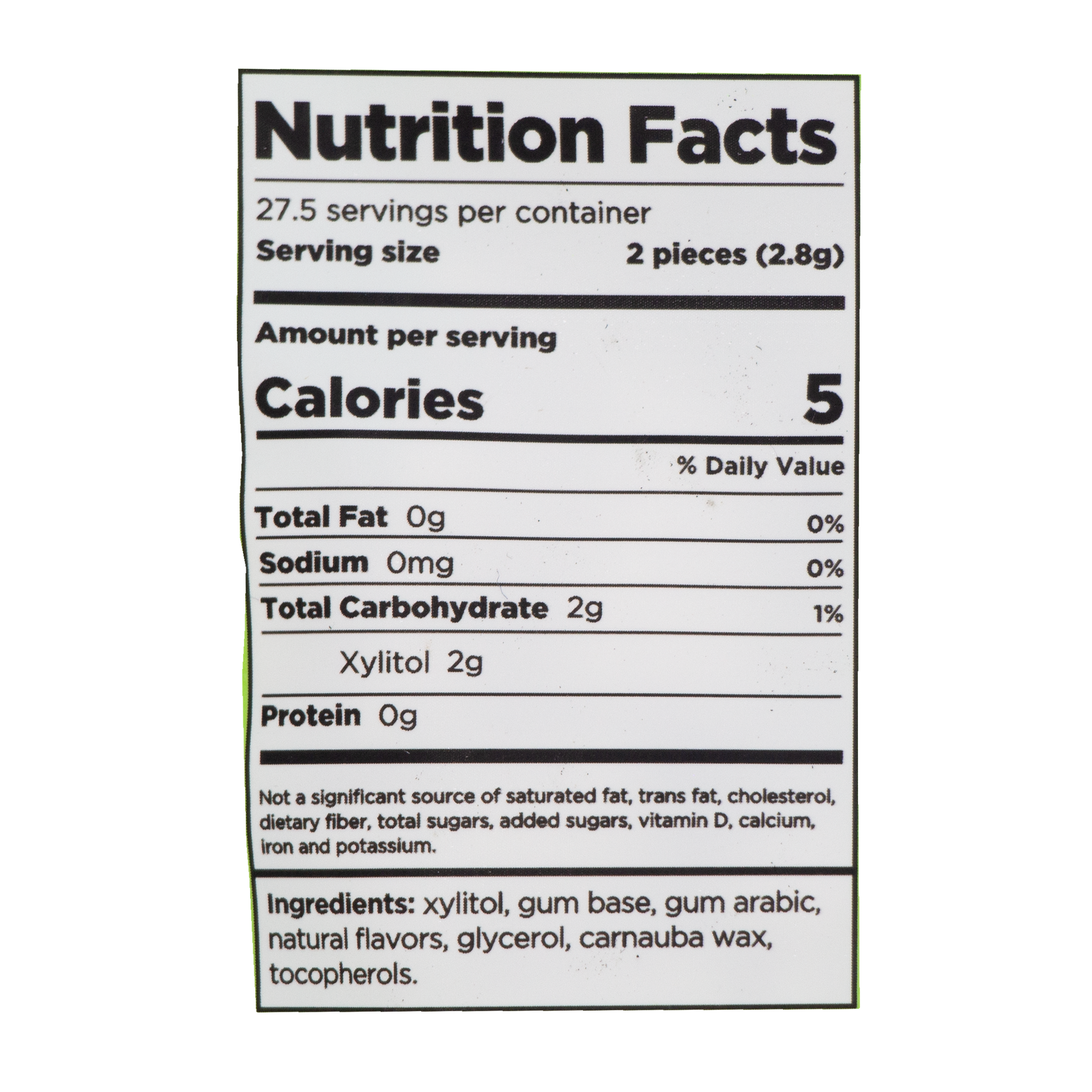 xilitol, goma base, goma arábiga, saborizantes naturales, glicerol, cera de carnauba, tocoferoles