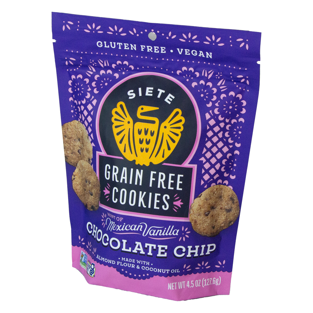Mezcla de harinas sin granos (harina de almendras, harina de tapioca, harina de arrurruz, harina de yuca, harina de garbanzo), aceite de coco, chips de chocolate (azúcar de caña, chocolate sin azúcar, manteca de cacao, extracto natural de vainilla), azúcar de coco, azúcar de caña, aceite de aguacate, vinagre de sidra de manzana, sal marina, extracto de vainilla mexicana, bicarbonato de sodio, extracto de té de jazmín.