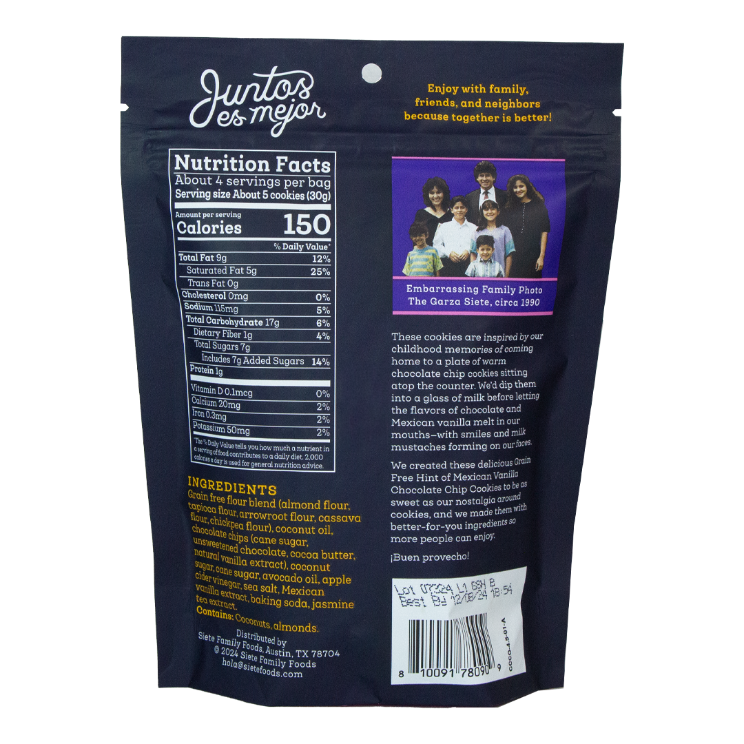 Crearon estas deliciosas galletas de chispas de chocolate con sabor a vainilla mexicana sin cereales para que sean tan dulces como nuestra nostalgia por las galletas, y las hicieron con ingredientes cuidadosamente seleccionados, para que más personas puedan disfrutarlas. ¡Buen provecho!