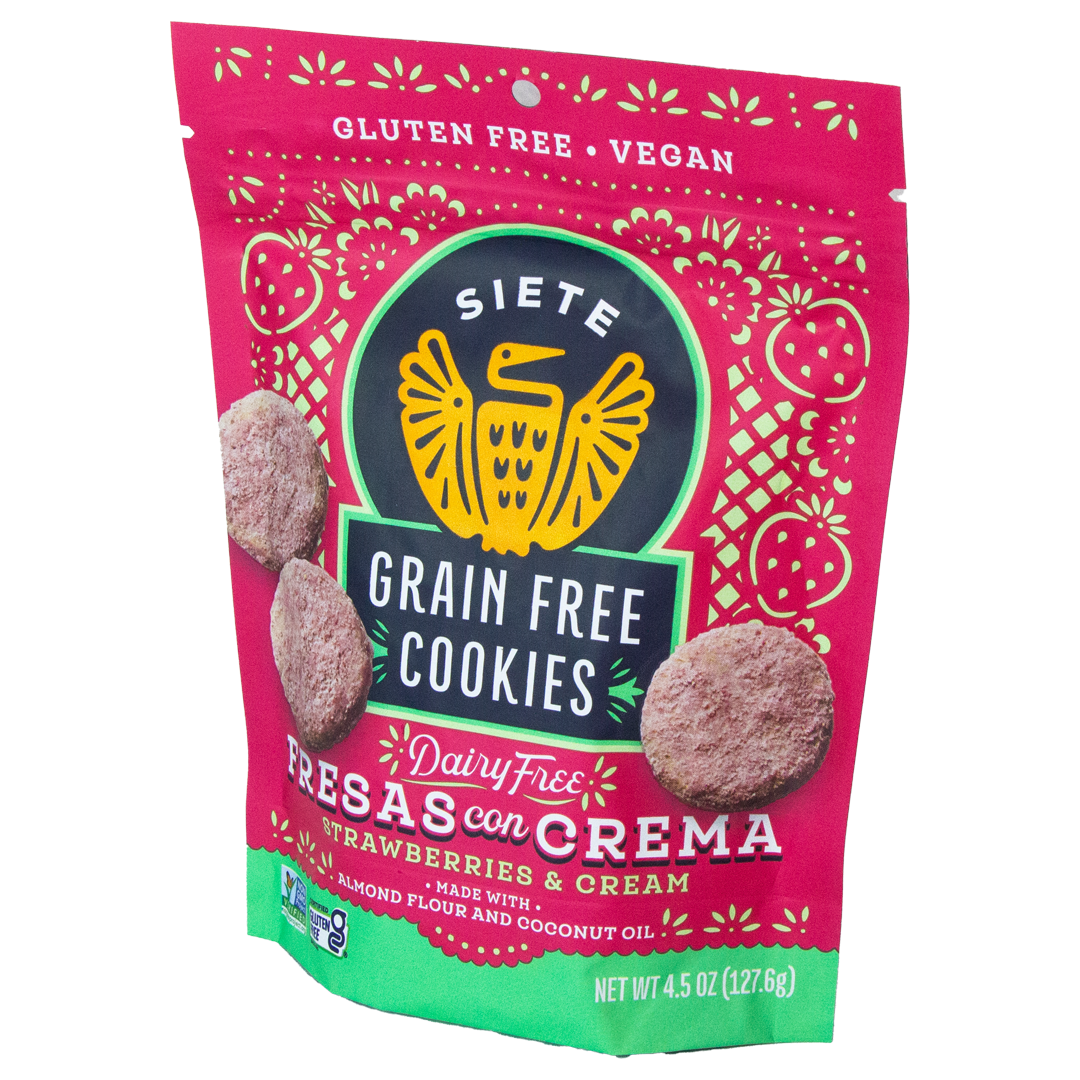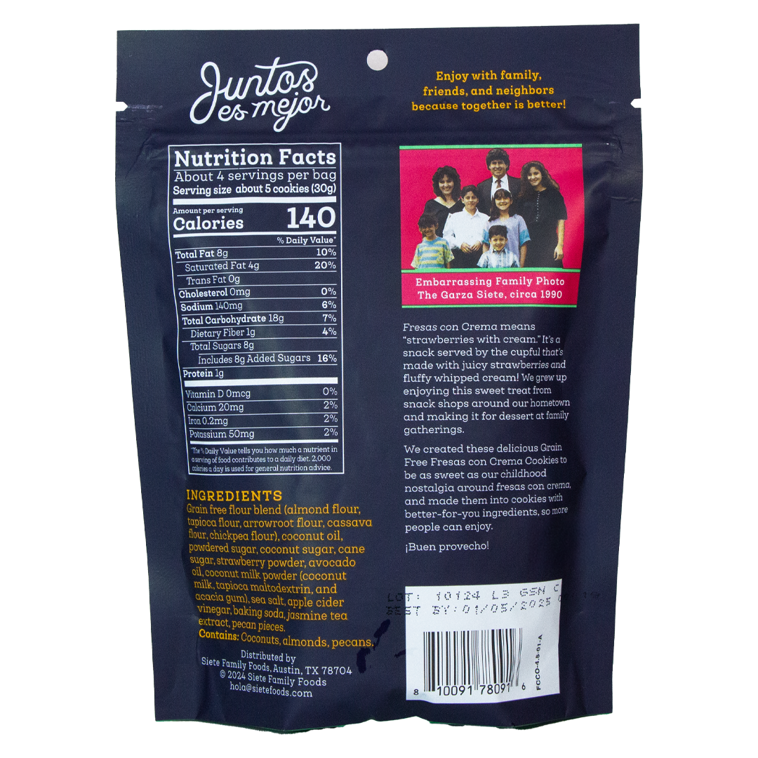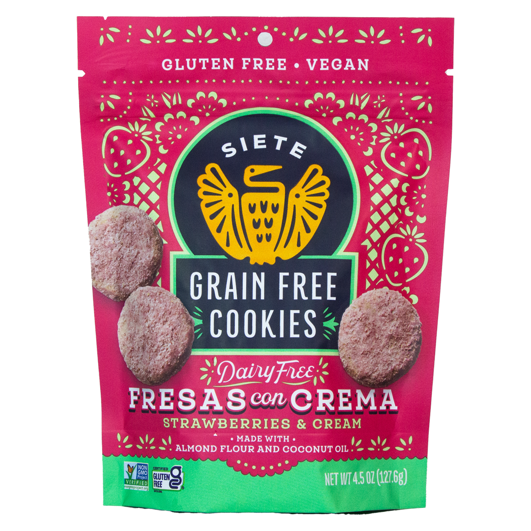 Ingredientes:Mezcla de harinas sin granos (harina de almendras, harina de tapioca, harina de arrurruz, harina de yuca, harina de garbanzo), aceite de coco, azúcar en polvo, azúcar de coco, azúcar de caña, polvo de fresa, aceite de aguacate, leche de coco en polvo (leche de coco, maltodextrina de tapioca y goma de acacia), sal marina, vinagre de sidra de manzana, bicarbonato de sodio, extracto de té de jazmín, trozos de nuez.
