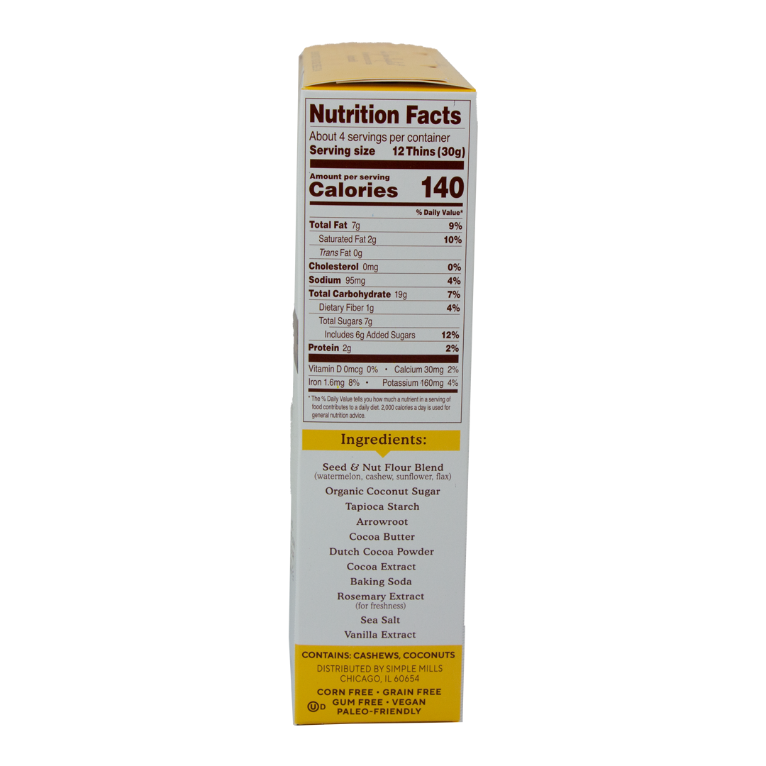 Mezcla de harina de semillas y nueces (sandía, anacardo, girasol, lino), azúcar de coco, almidón de tapioca, arrurruz, manteca de cacao, polvo de cacao holandés, extracto de cacao, bicarbonato de sodio, extracto de romero (para frescura), sal marina, extracto de vainilla