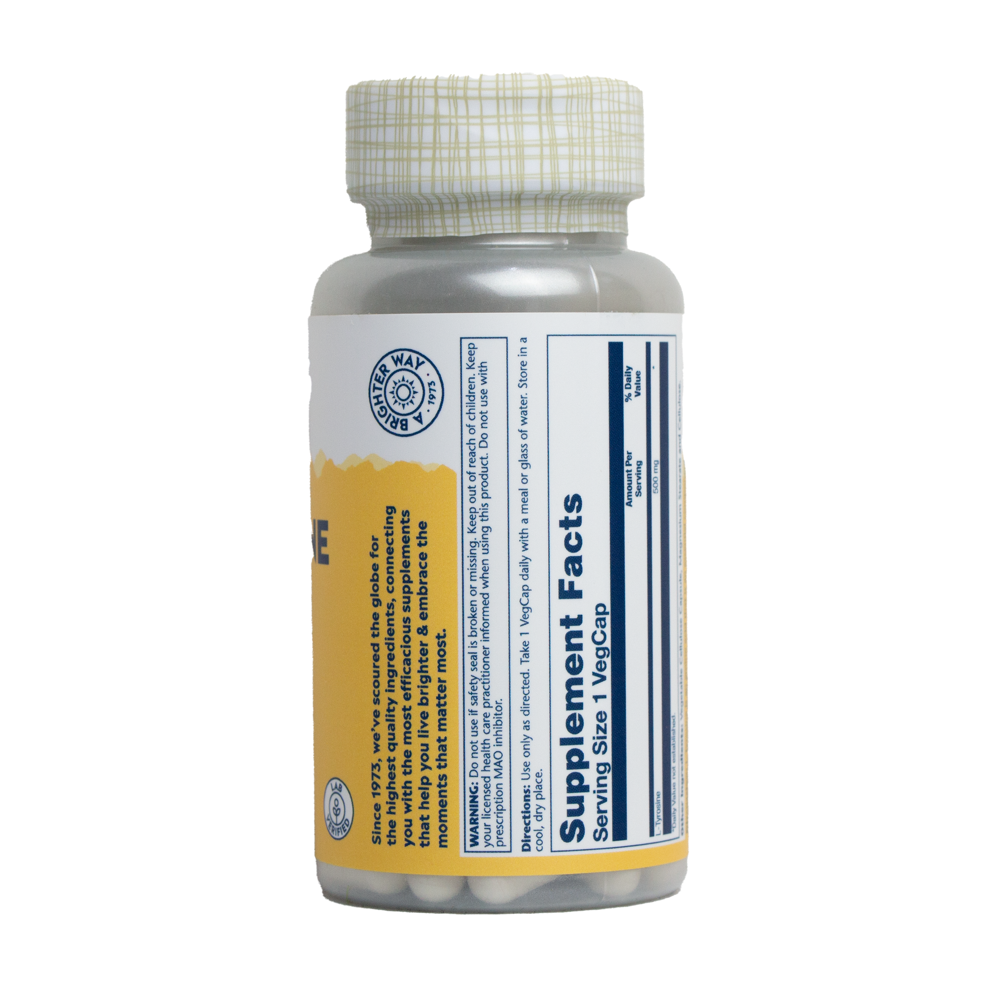 L-tirosina 500 mg de Solaray es un aminoácido producido de forma natural mediante un proceso de fermentación microbiológica y es un componente esencial de las proteínas que se encuentran de forma natural en el cuerpo humano.
