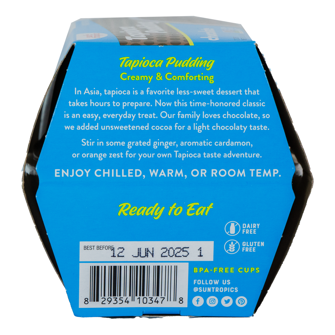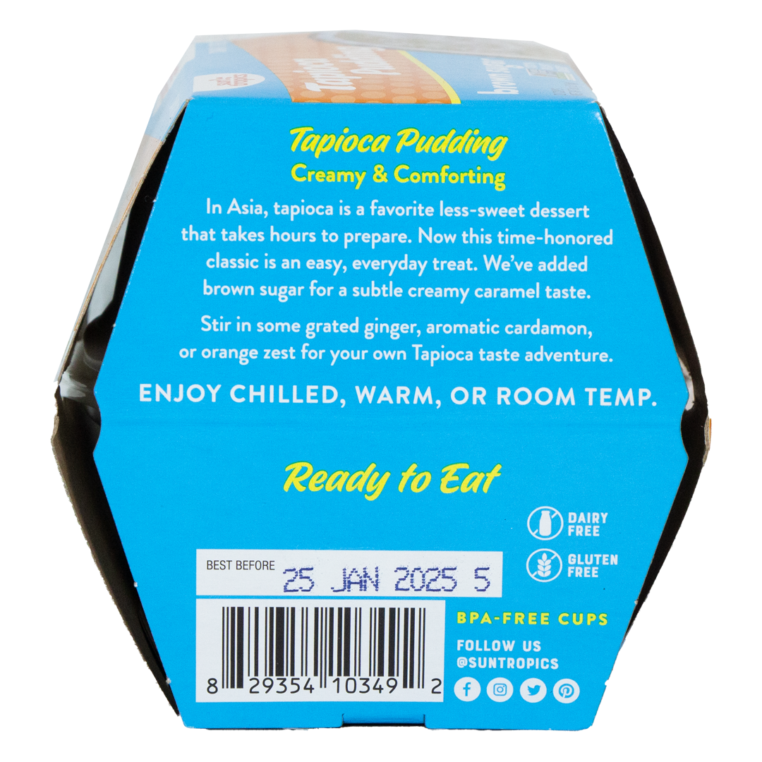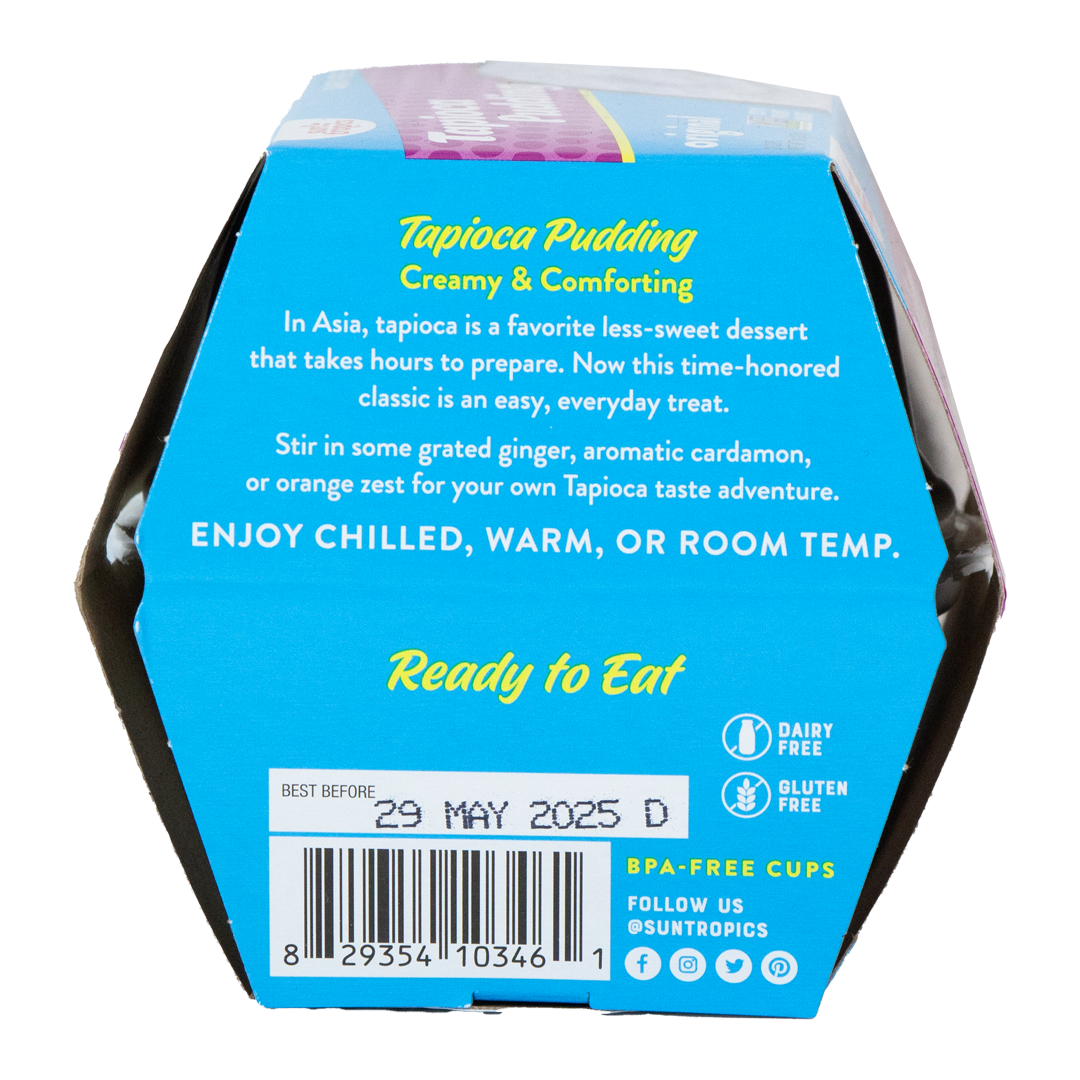 Cremoso y reconfortante. Pudín de leche de coco ligero y cremoso con perlas de tapioca suaves, listo para comer. Perfecto frío para refrescarte y saciarte en cualquier momento, calentado con compota de frutas para un reconfortante desayuno o un bocadillo a media tarde.
