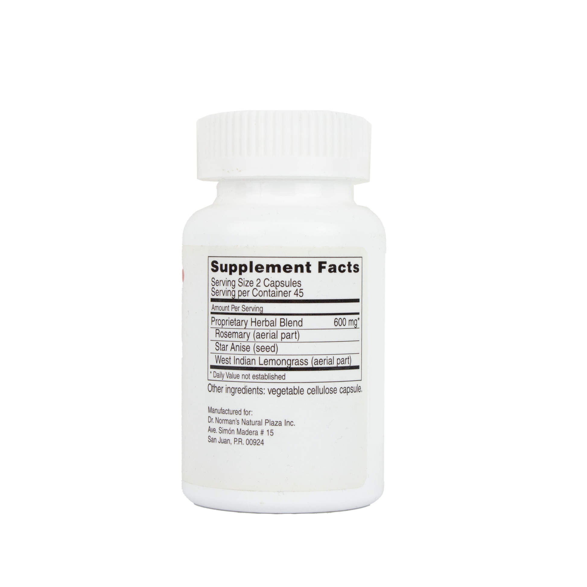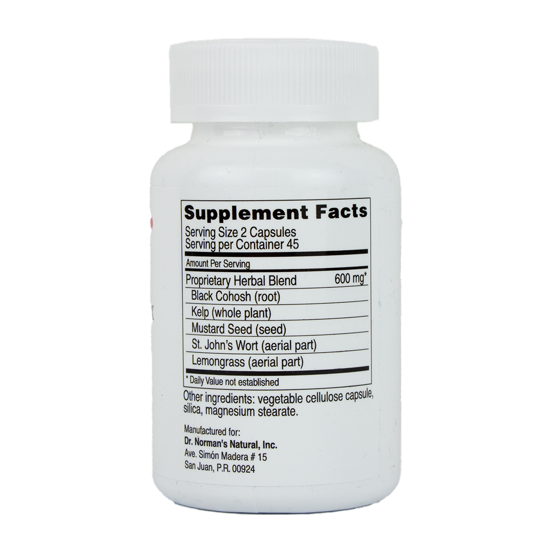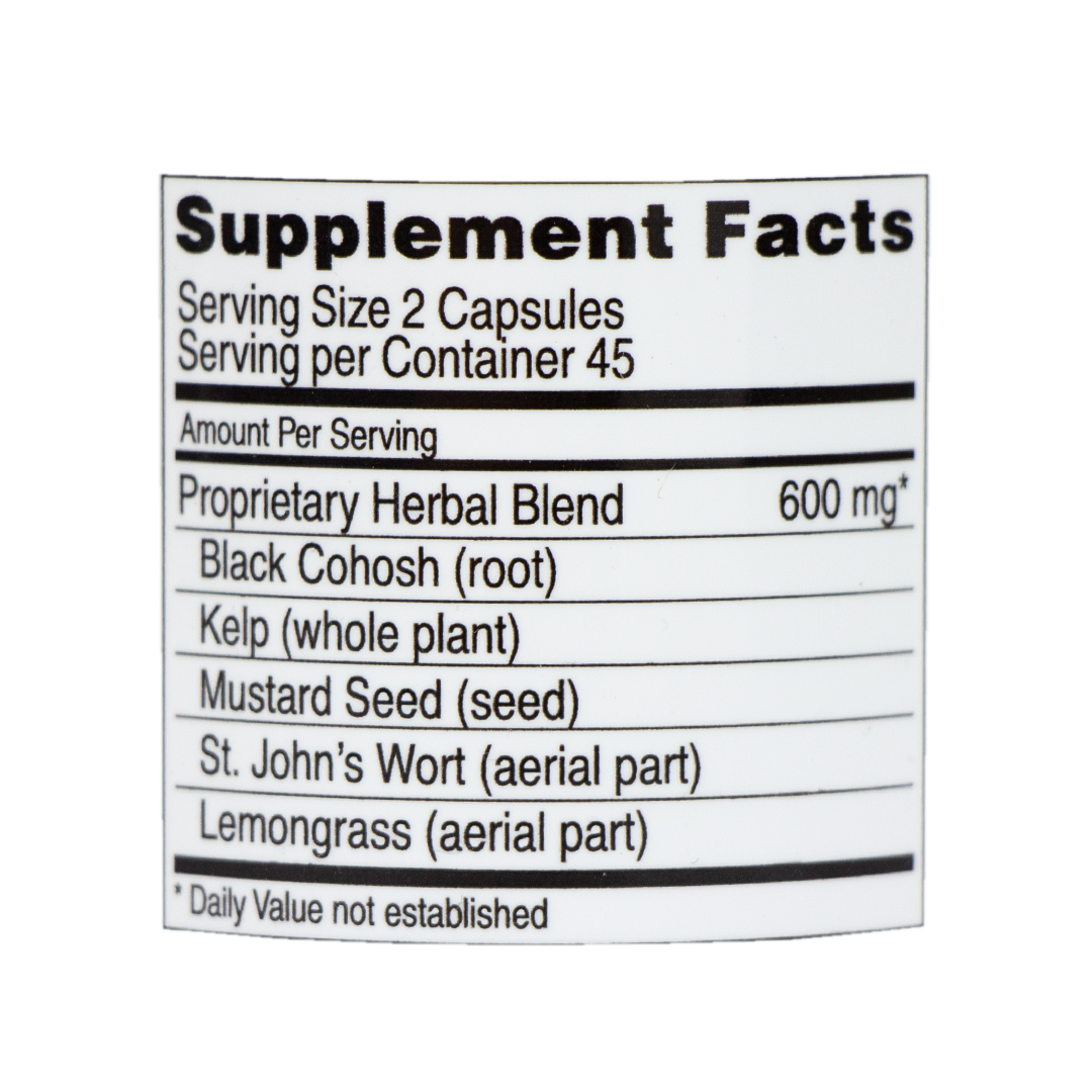 Ingredientes: Mezcla de hierbas propietaria, Cohosh negro (raíz), Kelp (planta entera), Semilla de mostaza (semilla), Hierba de San Juan (parte aérea), Limoncillo (parte aérea)