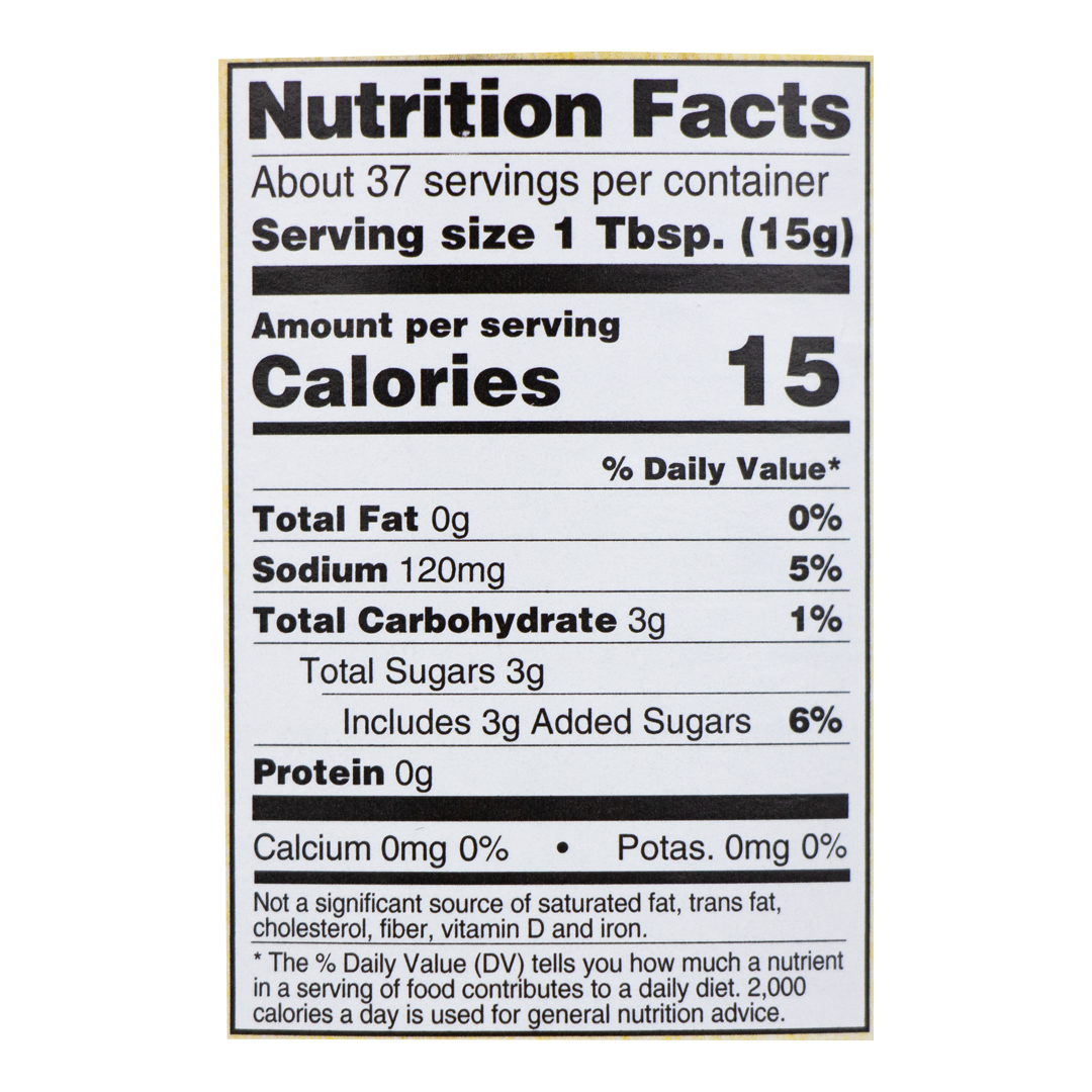 Pepinos orgánicos, azúcar de caña orgánica, vinagre orgánico, agua, sal, contiene menos del 2% de cloruro de calcio, pimientos orgánicos deshidratados, goma de xantano, especias orgánicas (contiene apio), sabor natural (contiene apio), goma arábiga orgánica, orgánica extracto de cúrcuma (color).