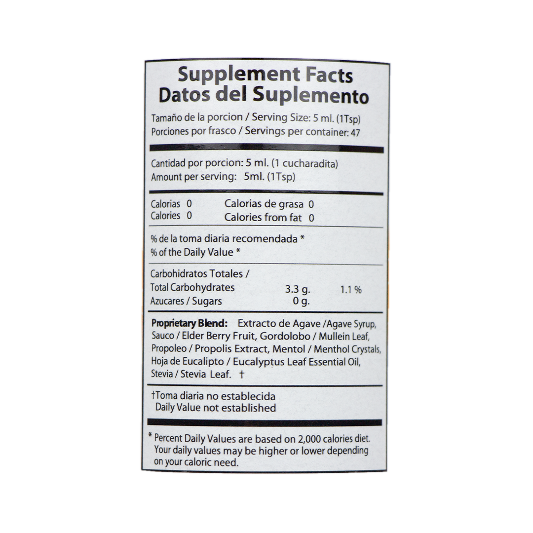 Proprietary Blend: Agave Syrup, Eucaliptus Leaf, Elderberry Fruit, Propolis, Menthol Crystals, Mullein Leaf), Stevia