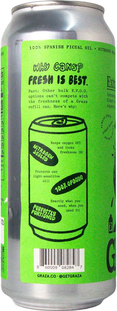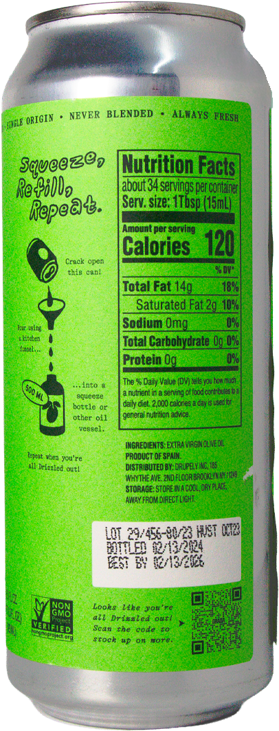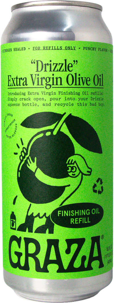 Con porciones perfectas y 100 % reciclables, nuestras recargas de "lata de cerveza" están diseñadas para mantener tu delicioso aceite de oliva fresco. Solo ábrelas, viértelas en una botella flexible (¡con un embudo de cocina!) y ¡a cocinar!